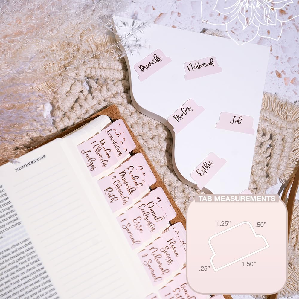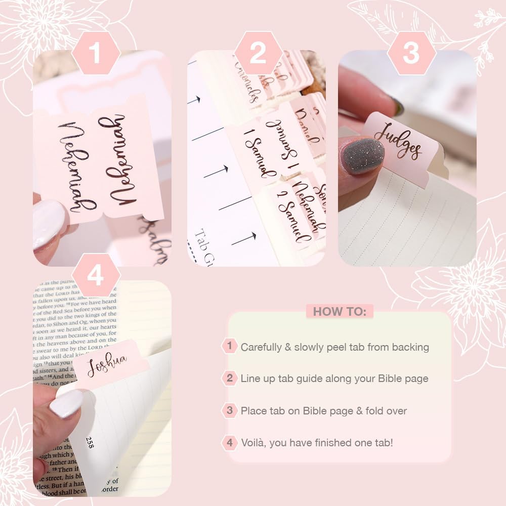 Easy Installation: Tabs come with directions and a tab guide for perfect placement in your Bible; Each tab is pre-cut and self-adhesive so simply peel, align in your Bible, and stick!
