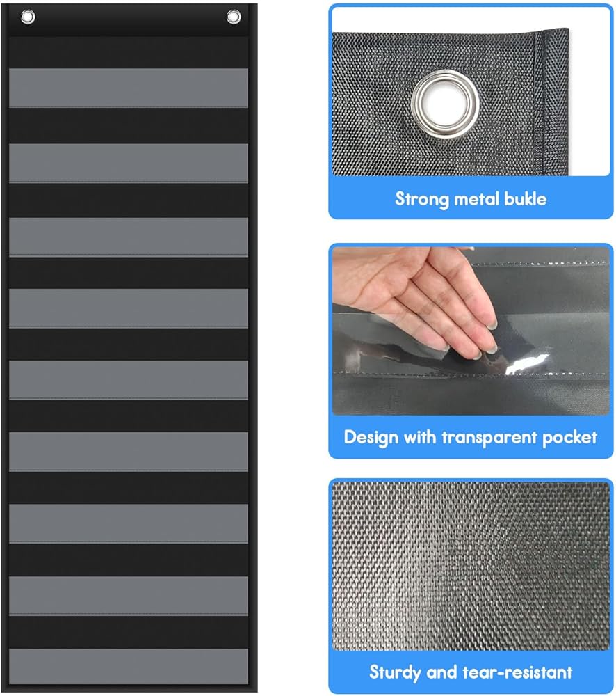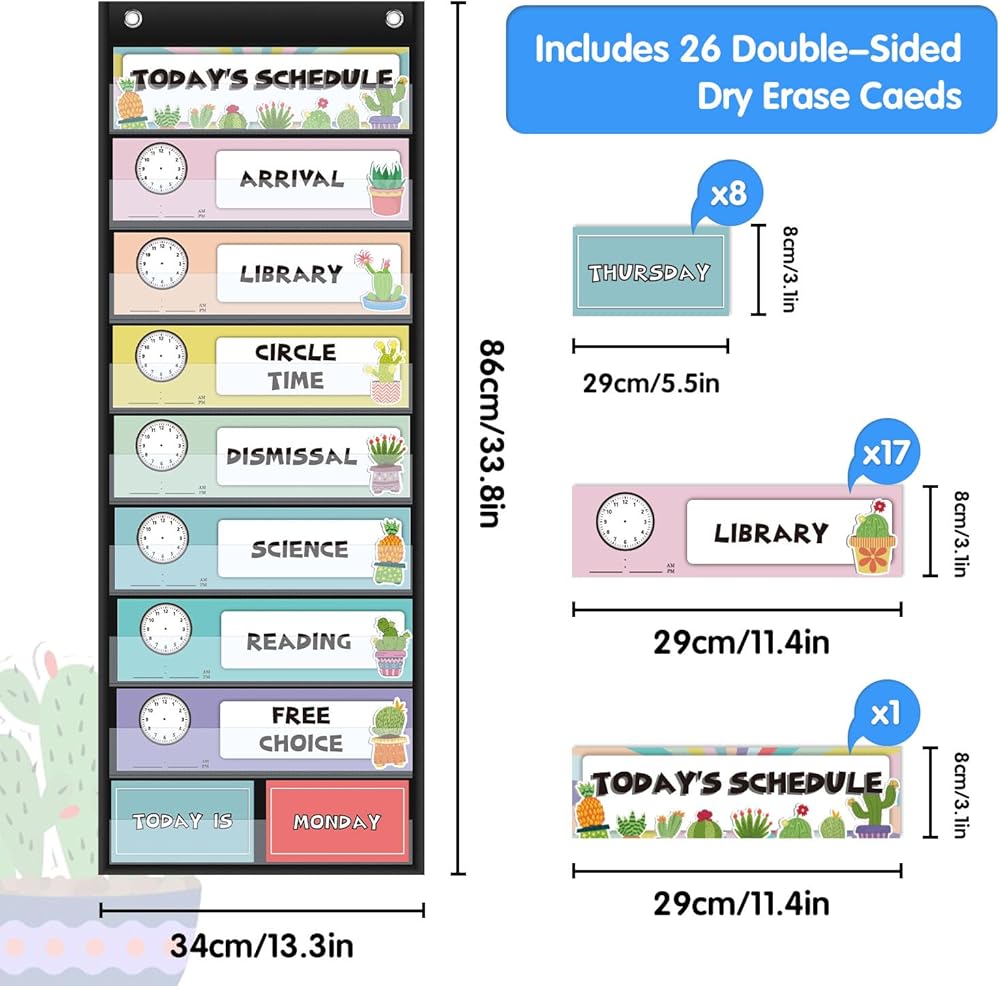 The Daily Schedule Pocket Chart made of durable polyester,easy clean.deluxe 26 Scheduling Cards:18 double-sided subject cards and 7 day cards