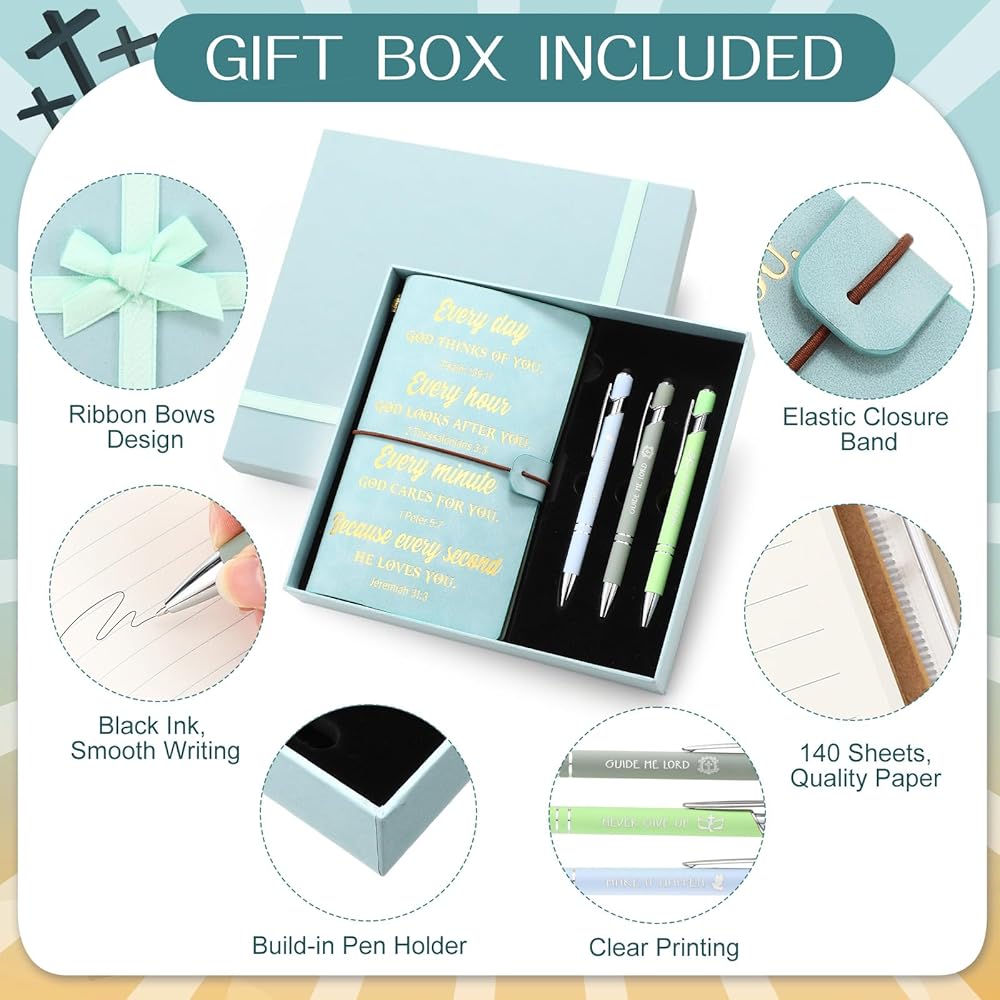 This gift box contains one each of a leather notebook, a religious bookmark, and a religious keychain, plus three ballpoint pens. It's a comprehensive gift set ideal for birthdays, anniversaries, or appreciation gifts to your loved ones.