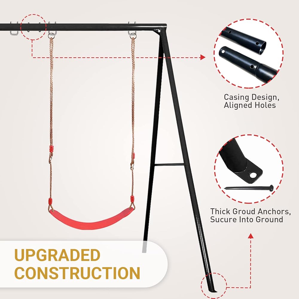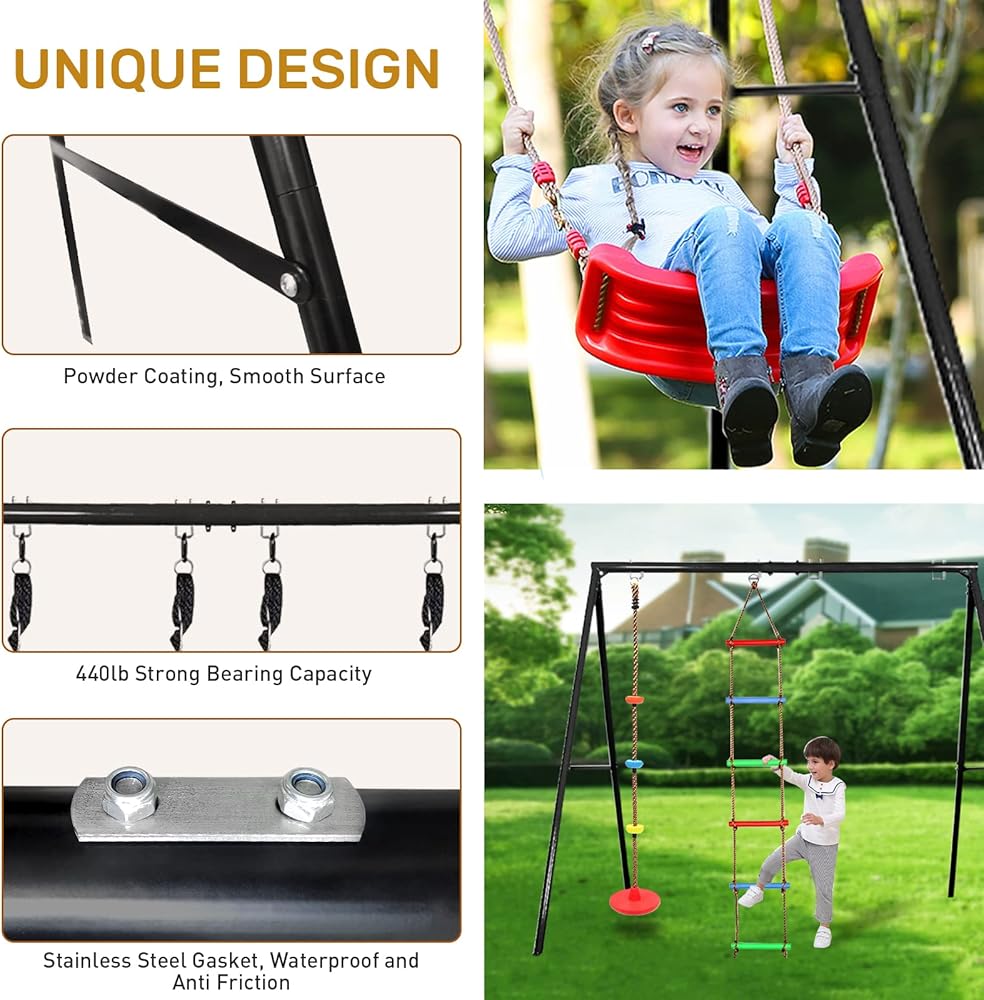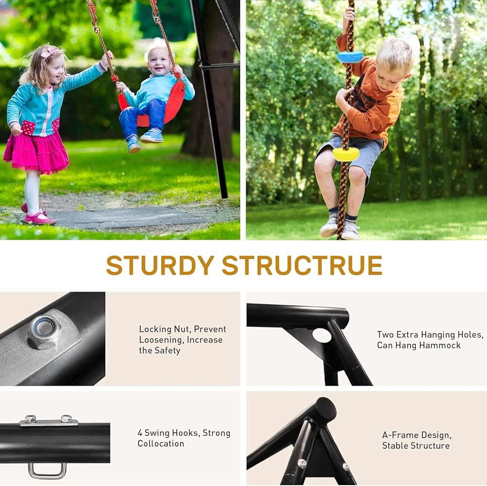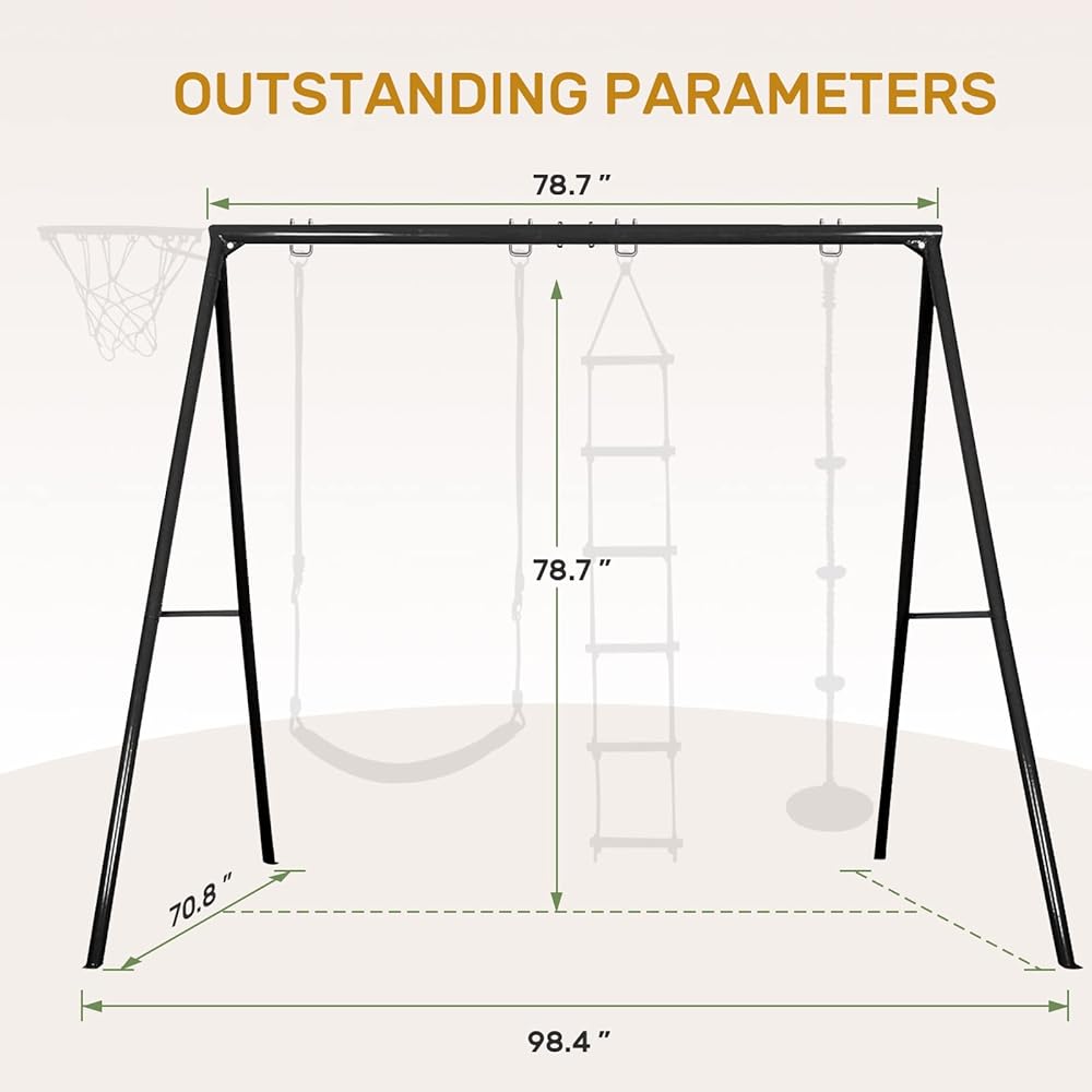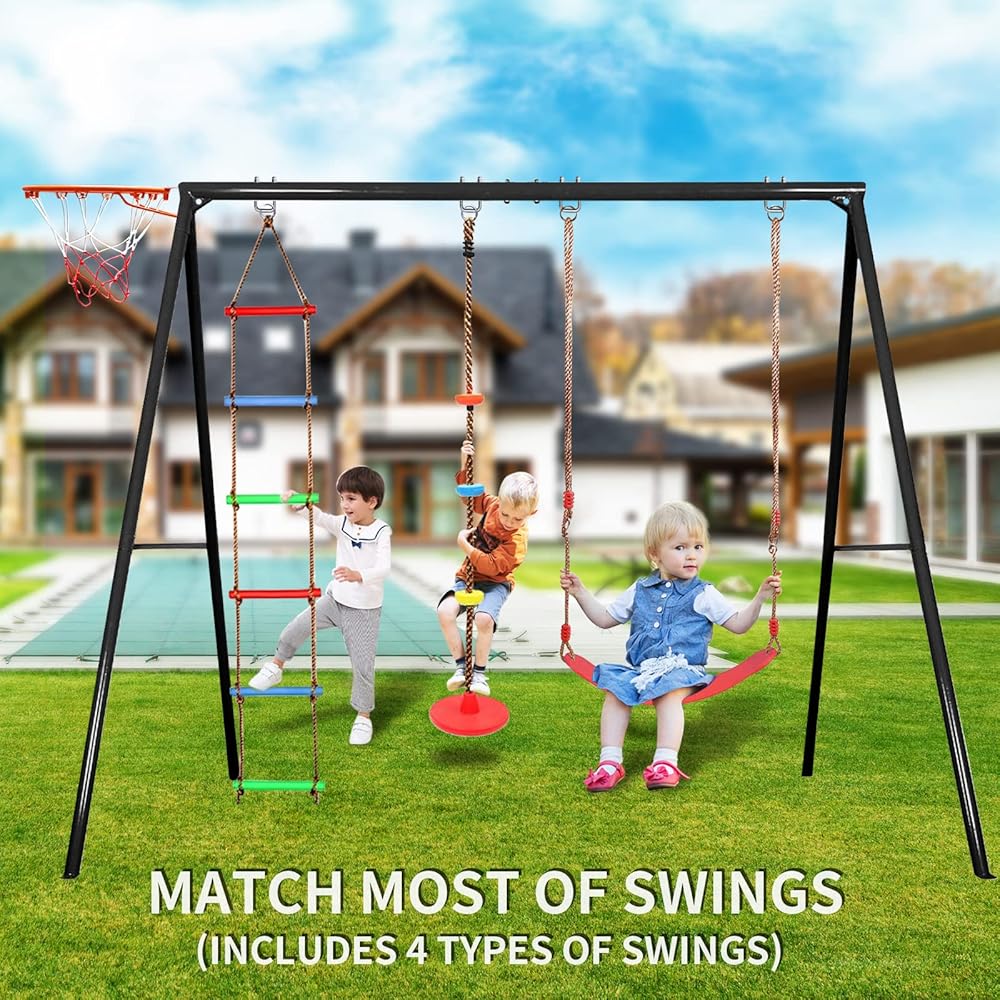IKARE 440lbs Swing Set Heavy Duty Metal Swing Frame with 1 Belt Swing, 1 Climbing Net, 1 Climbing Ladder, 1 Basketball Hoop,Fits for Most Swings, Extra Large, Great for Indoor and Outdoor Activities