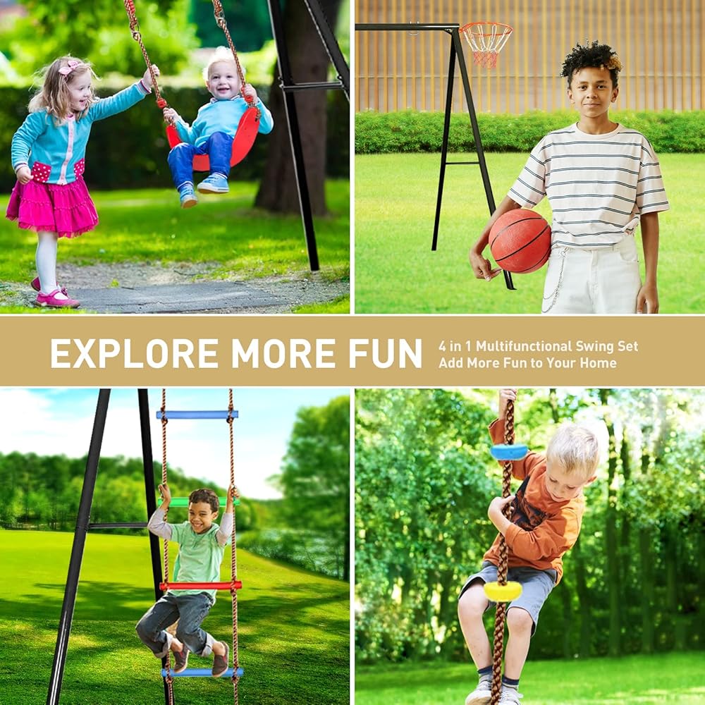 【4 in 1 Multifunction】 Our swing set includes 1 Belt Swing + 1 Climbing Net + 1 Climbing Ladder + 1 Basketball Hoop + 1 metal swing frame. Easily bring unlimited joy and a healthy lifestyle to your family, add more fun to your children in childhood.