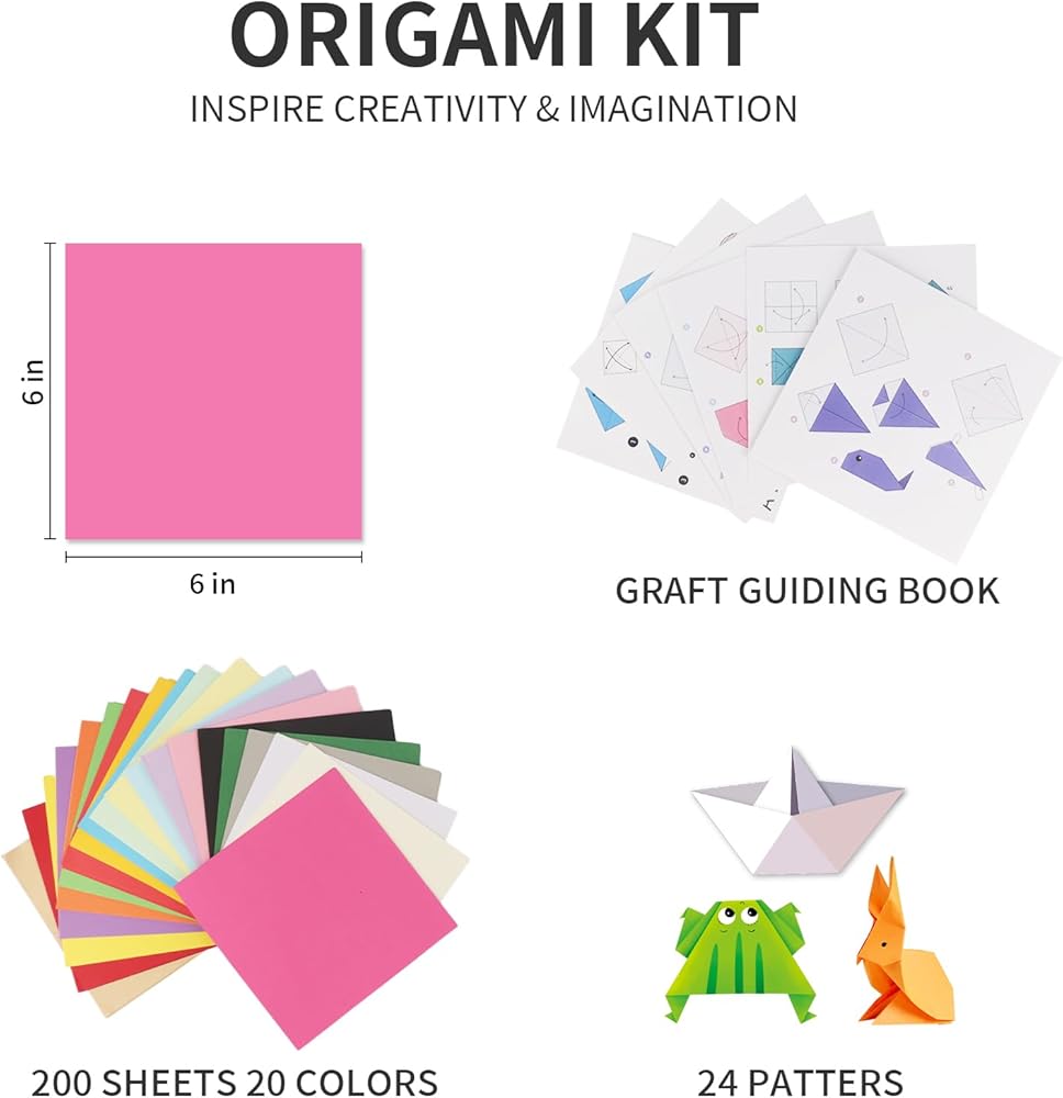 COLORFUL ORIGAMI KIT:Our high-quality origami paper set come with 200 sheets of double sided colors origami paper 8x8 inch & a Guiding Book with 24 Origami Projects.This all-inclusive origami kit is perfect for beginners to gain confidence and explore the art of origami.