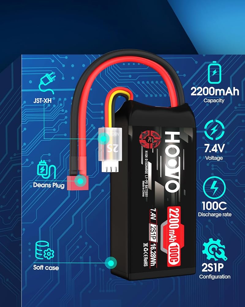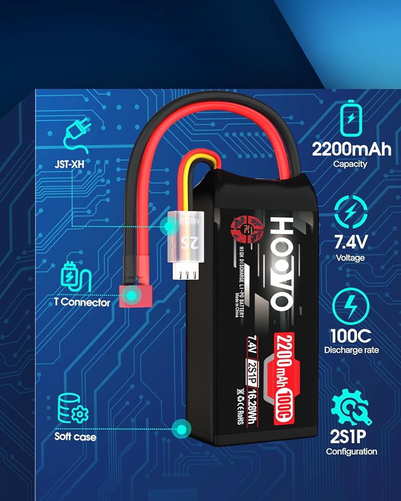 What You Get - 2 pack Hoovo 2s lipo battery XT60 connector 7.4V 2200mAh 100C soft case battery, Brand Stickers, User manual. HOOVO with the most advanced production technology and strict QC teams; Any questions about product, click the "Ask a question"on our storefront or in "Your Order" Options click the "contact seller". We will reply you within 24 hours