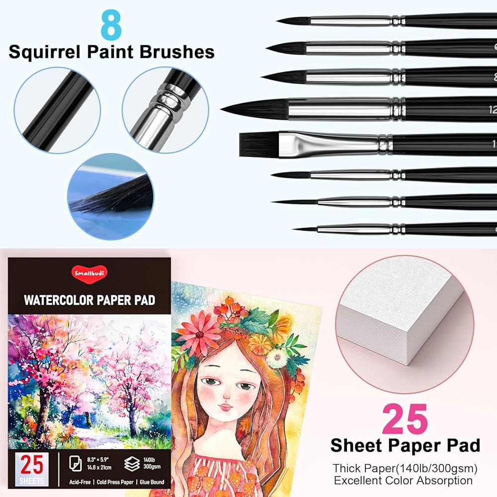 Watercolor Kit With Paint Brushes And Paper - To prepare you for a wonderful painting journey, we provides all the painting accessories you need. You got 8 synthetic squirrel hair paint brushes with excellent paint absorption, 25 sheet thick watercolor paper with cold-pressed texture, 6 water brush pens with flat and pointy tip to create different strokes. This is the perfect bundle for beginners and hobbyists