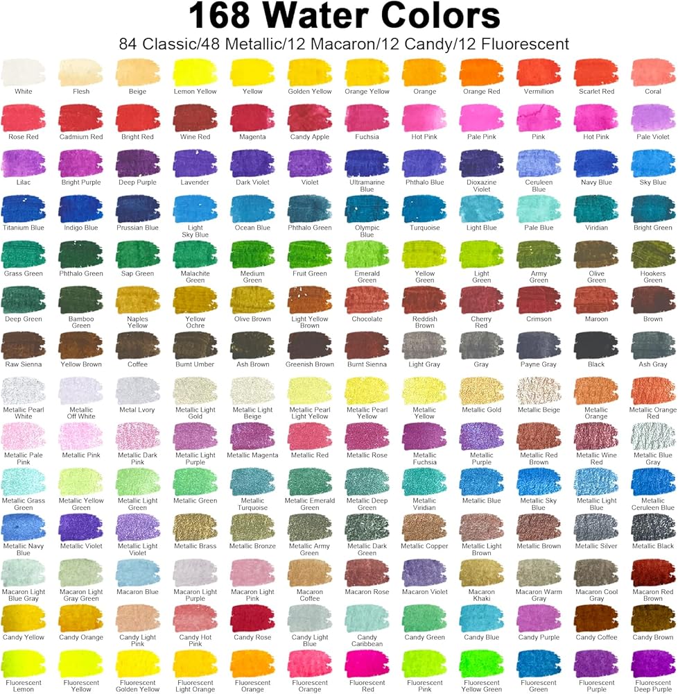 100 Vivid Colors - This watercolor paint set includes 50 regular colors, 35 metallic, 10 candy and 5 fluorescent colors. The 50 regular colors can meet the need of daily painting while the metallic and fluorescent colors add more possibility to your art work