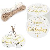 Package & Size - Includes 100 pcs round tags.Ever tags mrasures 1.97" x 1.97"/5cm x 5cm,Comes with two different string 33ft/10m jute twine and 33ft/10m cotton gold wire white twine (total length: 66ft/20m).Can perfectly pair with greeting card,invitation cards,gift wrapping,etc.