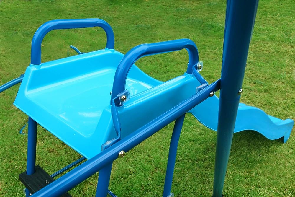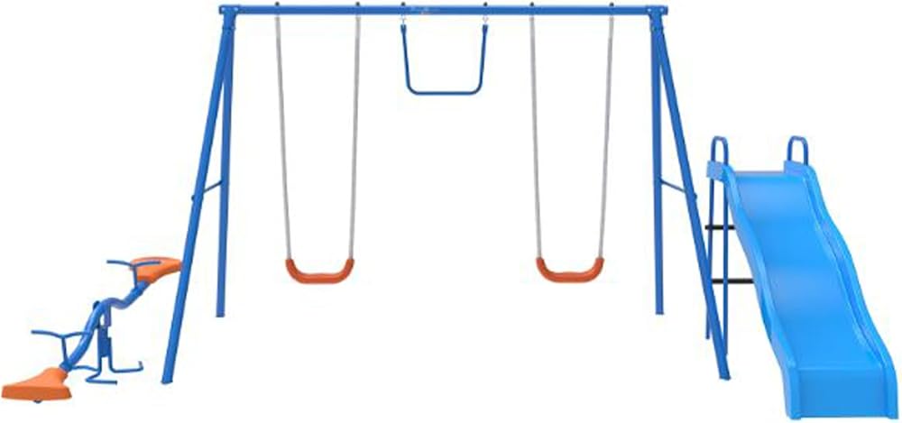 FITNESS REALITY KIDS. Have Fun! Play Safe! The FITNESS REALITY KIDS 6 Station Swing Set with Seesaw has all the fun features that will help kids stay active, healthy and develop Sports skills for a lifetime. Built with strong 2” tubular steel frame and has all the fun features that will help kids stay active, healthy and develop Sports skills for a lifetime. Designed for children ages 3-8 years old, this Sports playground includes 2 Swigs, 1 Slide with ladder, 1 trapeze bar and 1 Seesaw with spin balance. As kids play they are also getting a good workout and when they associate play and Sports that feeling will stay with them as long as they are challenged. The FITNESS REALITY KIDS Sports Metal Swing Set will get your kids outdoors instead of playing video games, on the computer or watching TV all day. So let your kids have fun with the FITNESS REALITY KIDS 6 Station Swing Set with Seesaw.