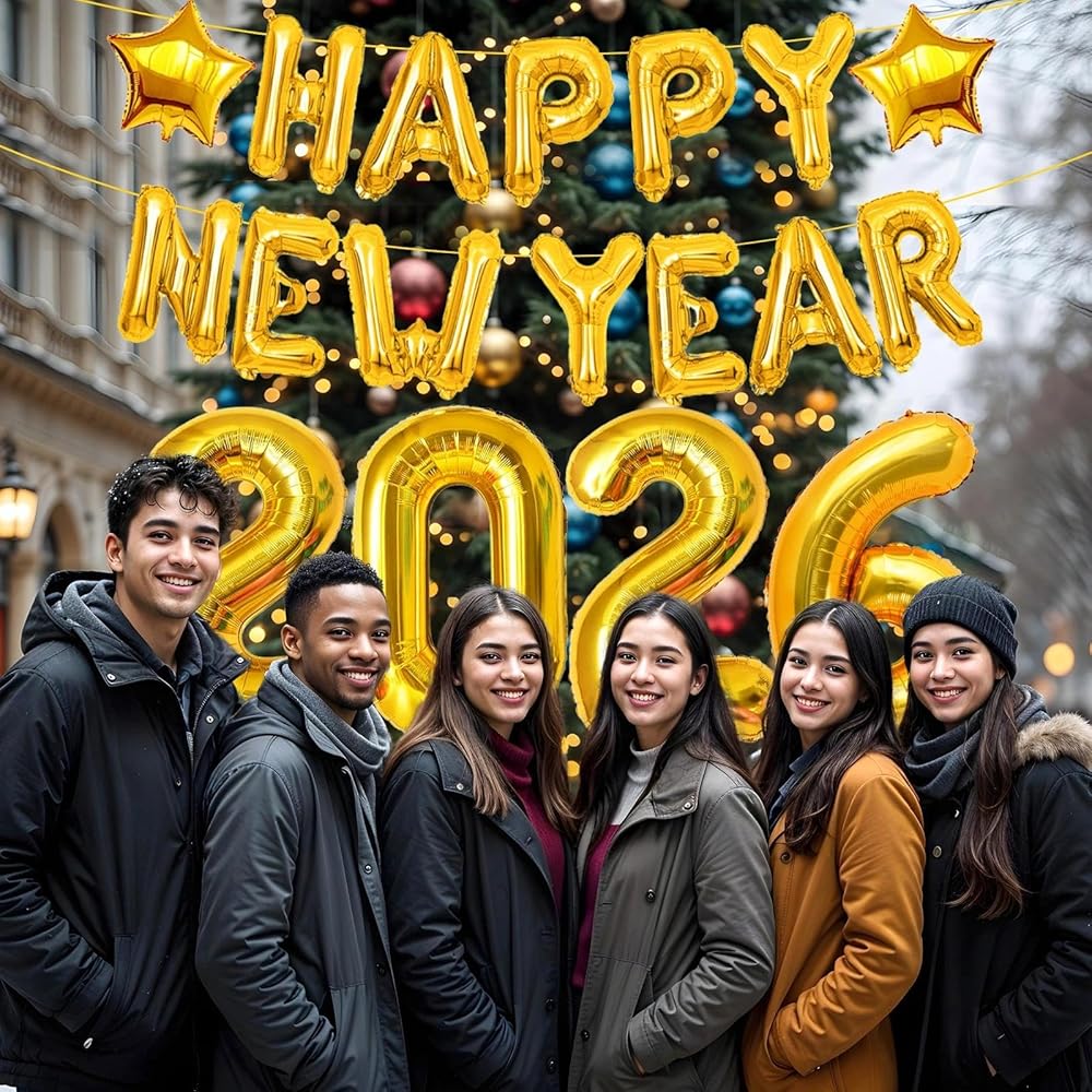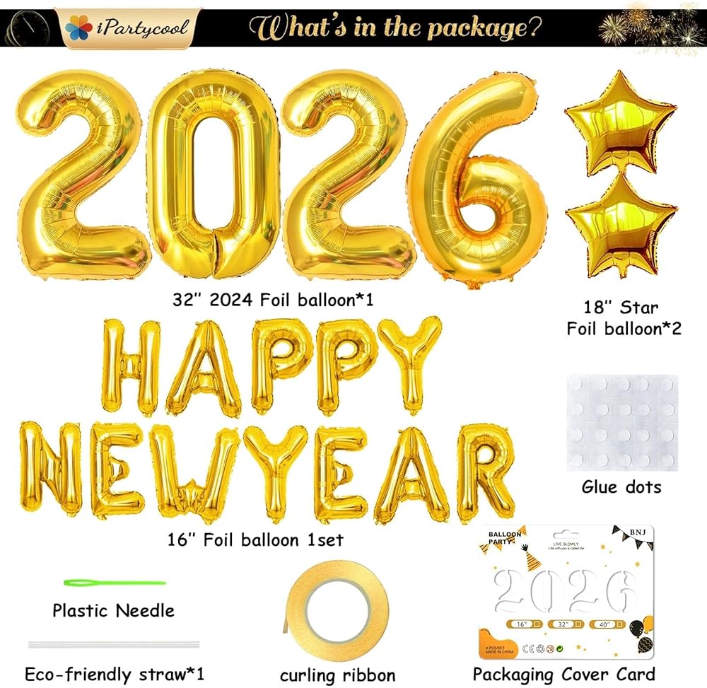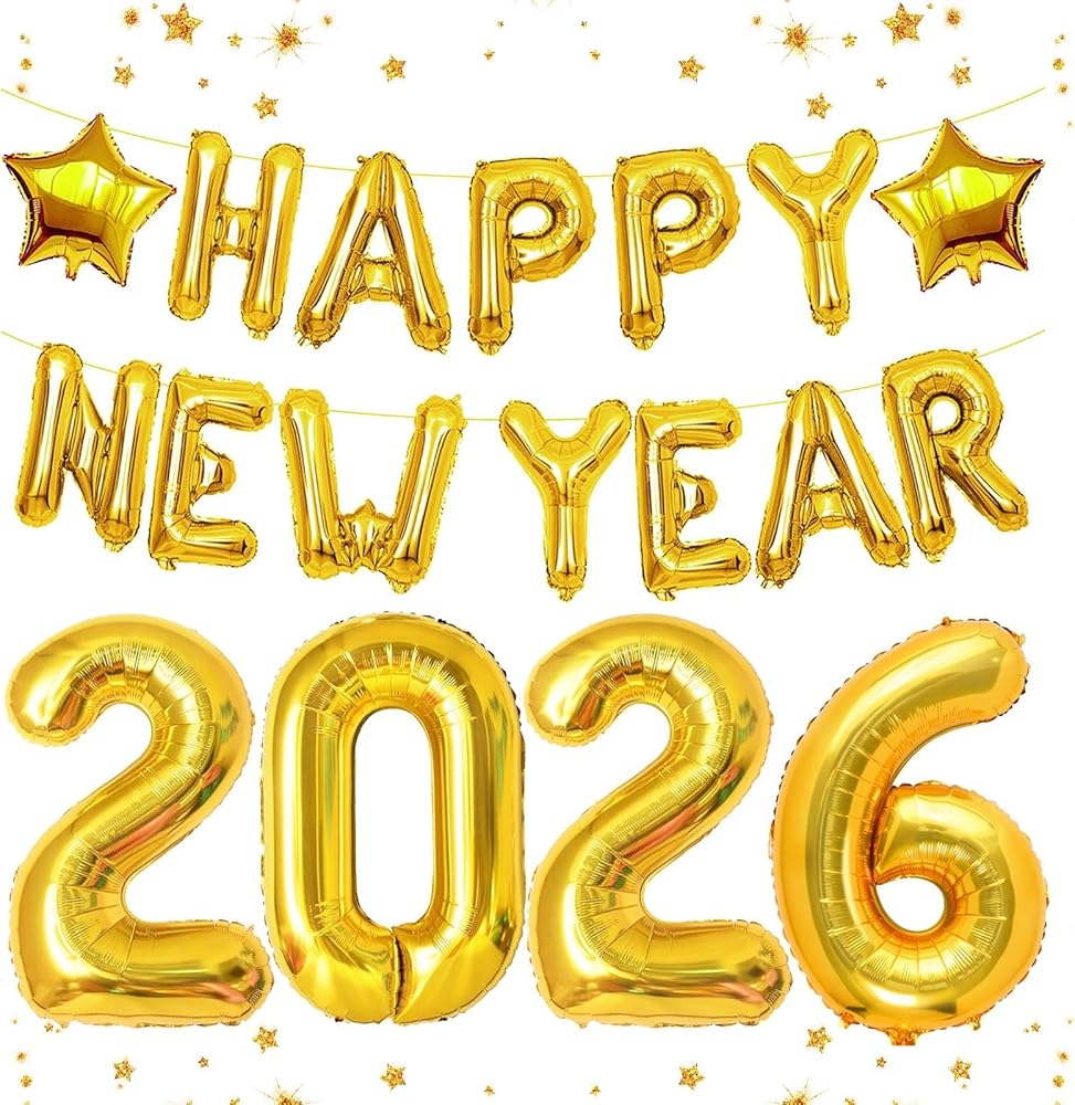 Upgraded, Large 32in 2026 Balloons +16in Happy New Year Banner Balloons (Premium Gold Foil), Ideal New Years Eve Party Supplies 2026, with Star Balloon, NYE Balloon, Perfect for NYE Decorations