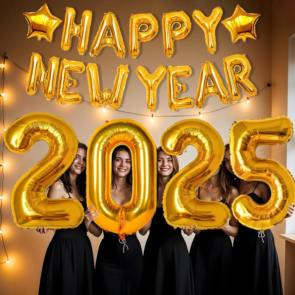 🎉【2025 Happy New Year Decorations 】Our gold 2025 balloons includes 32inch 2025 Number Balloons, 16inch "HAPPY NEW YEAR" balloons ,2pcs star balloons, 2pcs Inflatable Straws, 20pcs gluedots and 32ft Ribbon. Celebrate the final toast of the year with gold happy new year 2025 balloons. This shimmering colors of 32 Inch new year balloons 2025 will create a sparkling and classy effect for your happy new year decorations 2025. Light up an excitement for new years eve party supplies 2025.