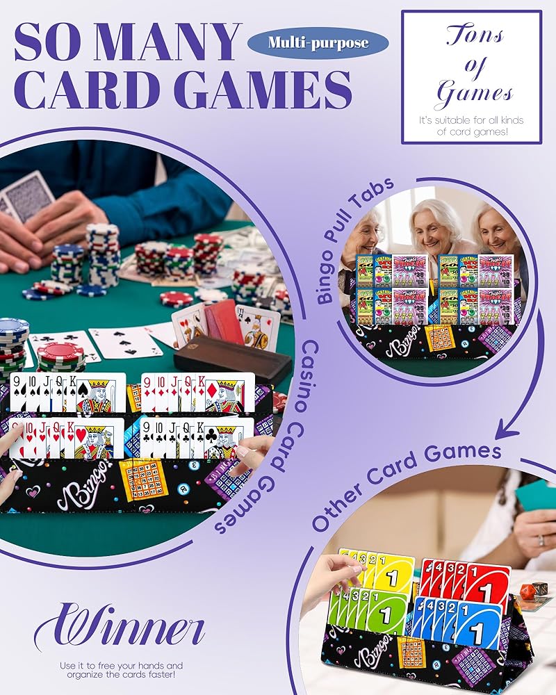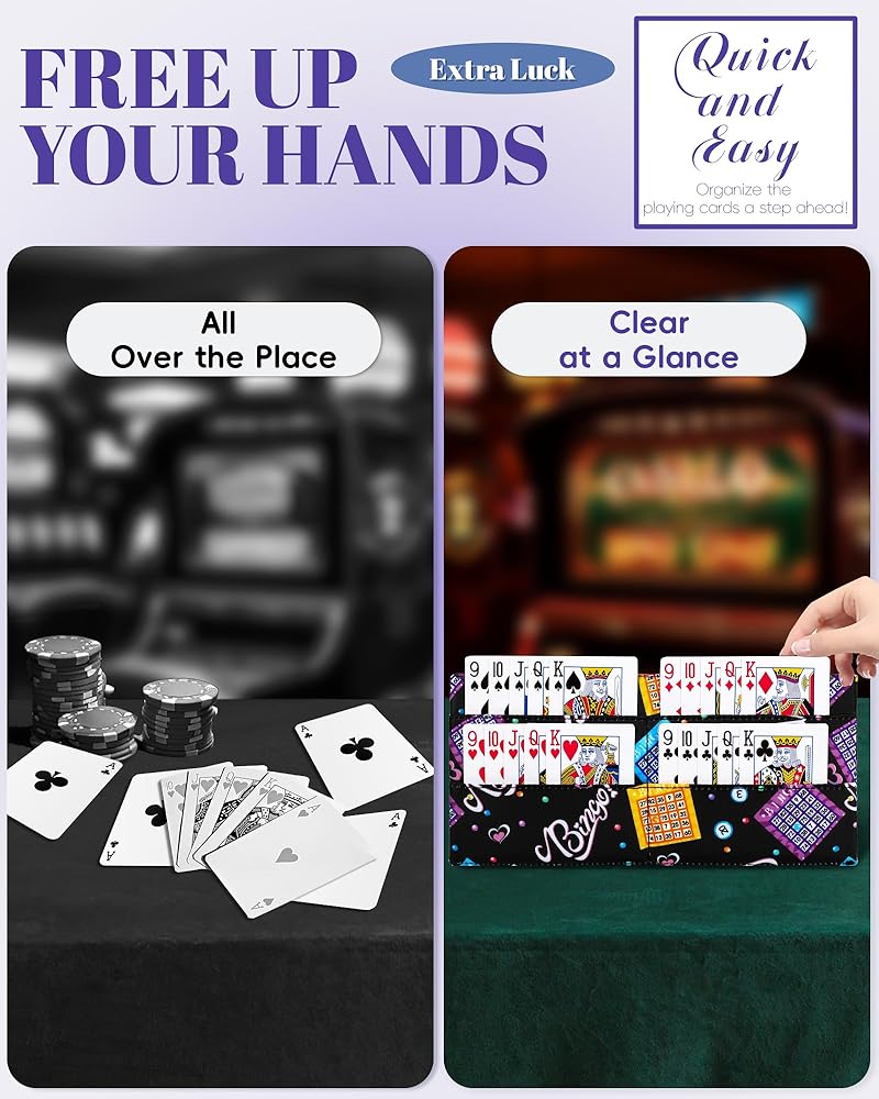 This playing card holder is 10.3"(L) and weighs only 0.45 lb, it can fold flat for carry or storage. It has 4 slots to get the cards well organized, which are a breeze to check and arrange around. Designed for long card games, it eases hand strain, ideal for seniors and kids or anyone with a weaker grip. Born for all kinds of playing card games and pull tabs gambling tickets, use it wherever needed.