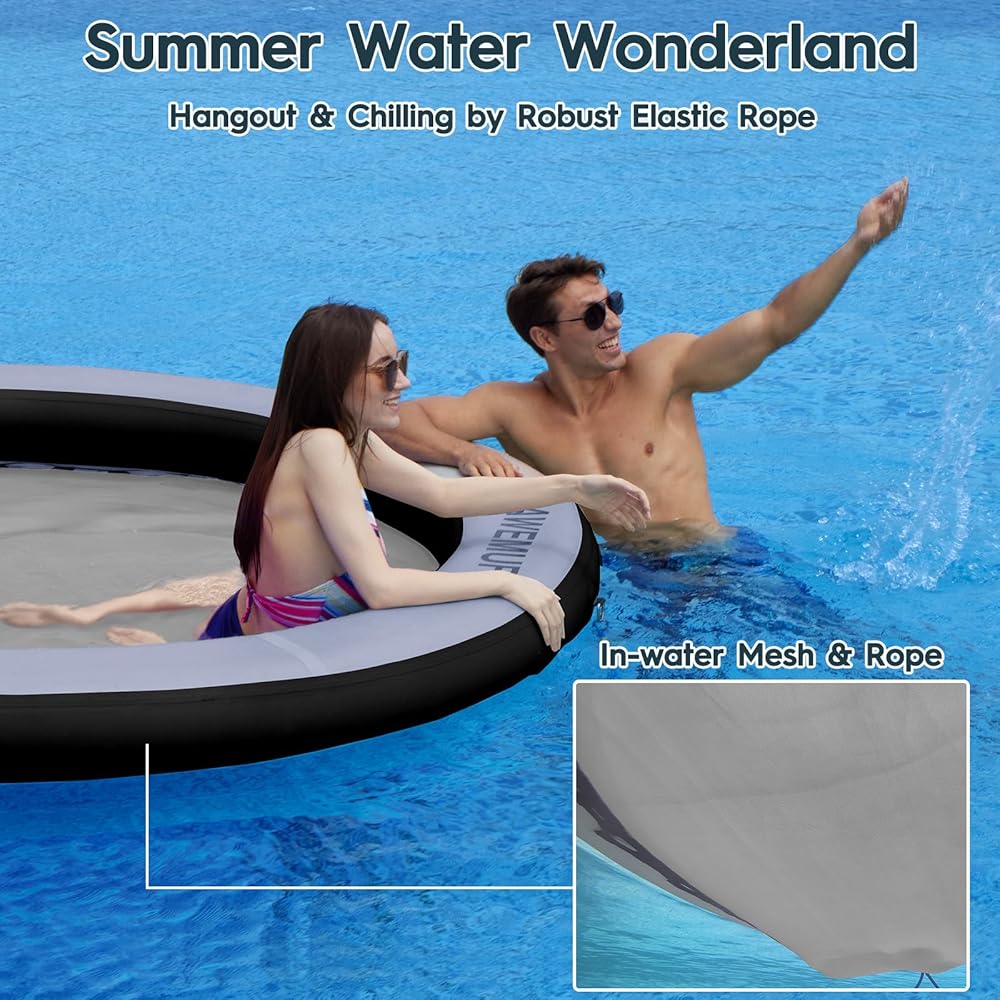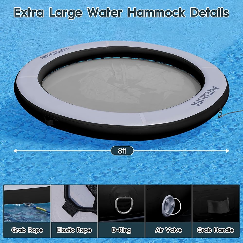 Multi-Functional Floating Island: Our 8ft water hammock with premium woven mesh serves as a versatile floating island, allowing you to stand, jump, climb, and play without the worry of sinking, flipping, or deflating. It serves multiple purposes such as a water hammock float, swim platform, sunbathing pad, boat dock float, water lounger floater, and more. Endless splish-splashing fun awaits for all ages! Moreover, it's resilient against any dog-induced wear and tear, so let loose and enjoy