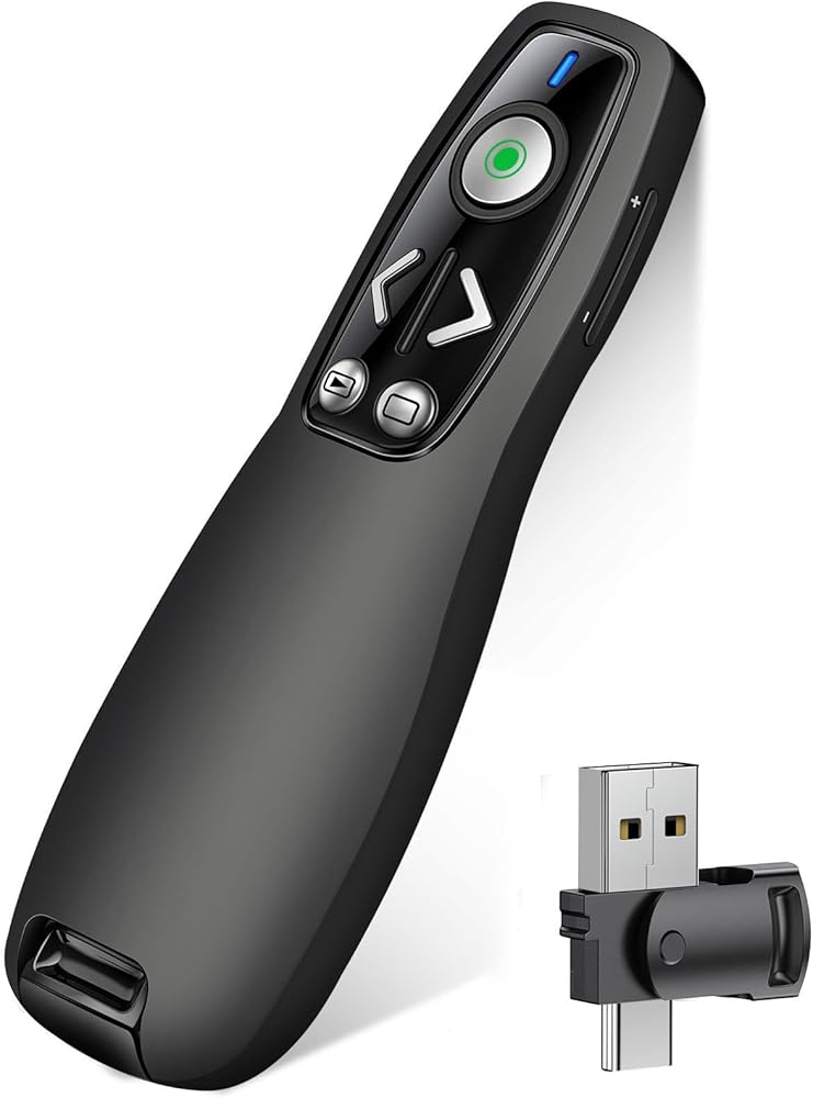 【LONG CONTROL RANGE OF THE CLICKER】With this pointer presenter remote, you can come out from behind the computer or podium and connect with your audience smoothly. The powerpoint clicker also has a wireless control range of up to 100 feet, so you can make your lectures more interactive rather than just talking to your students from standing at your desk clicking buttons