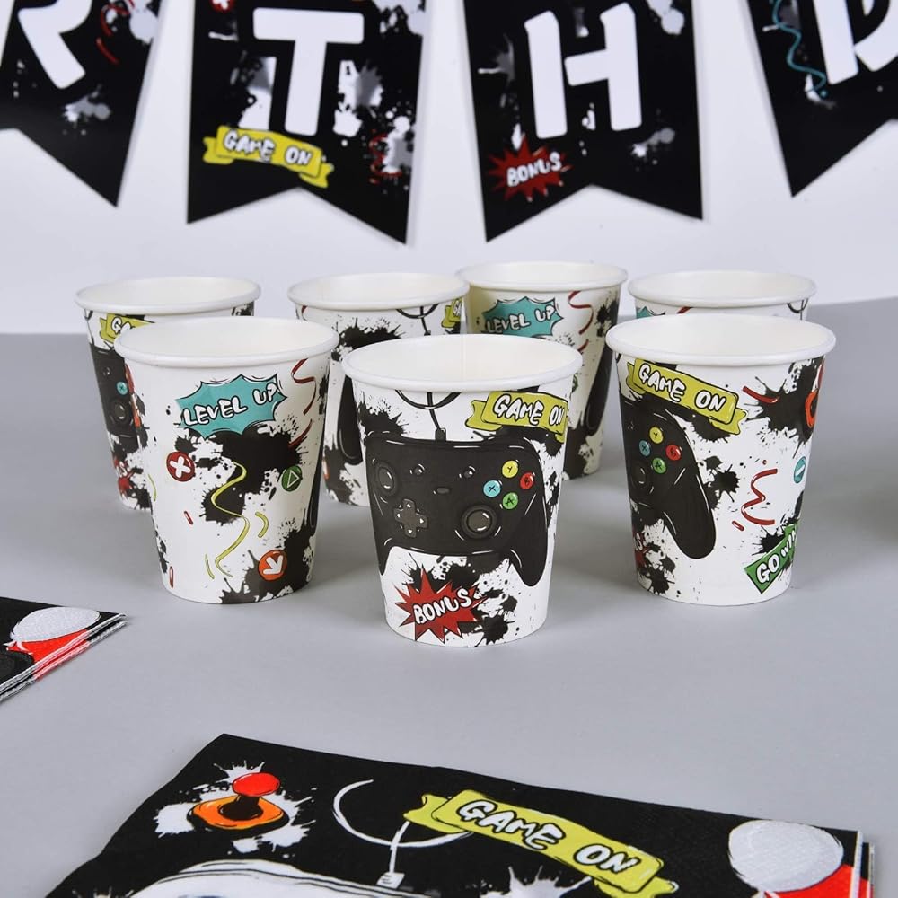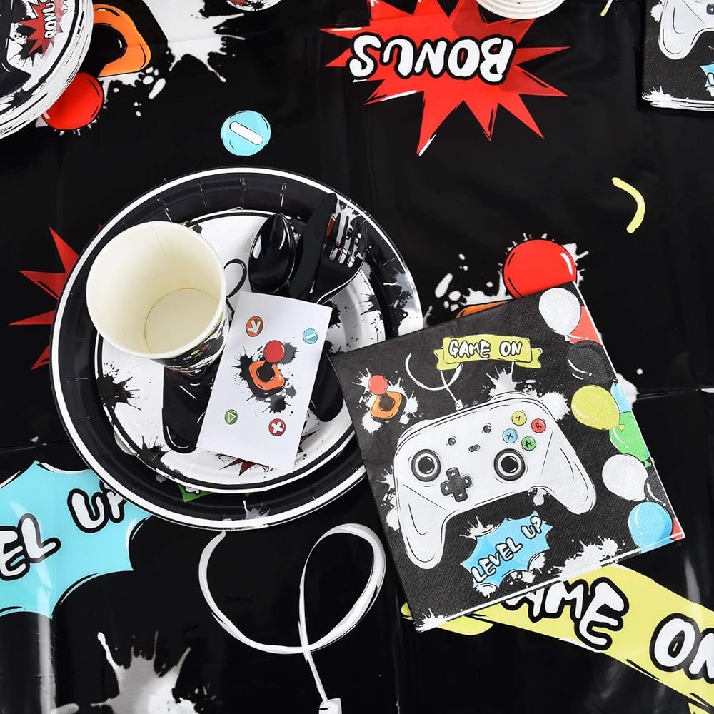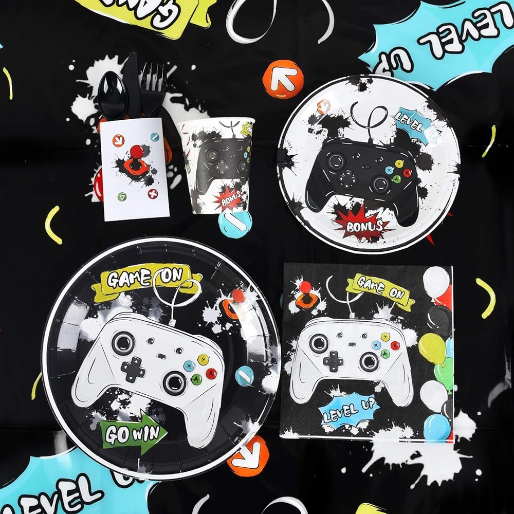 WERNNSAI Gaming Birthday Party Decorations - 153 PCS Video Game Party Supplies for Boys Birthday Banners Balloons Plates Cups Napkins Tablecloth Cutlery Bags Tableware Set Serves 16 Guests