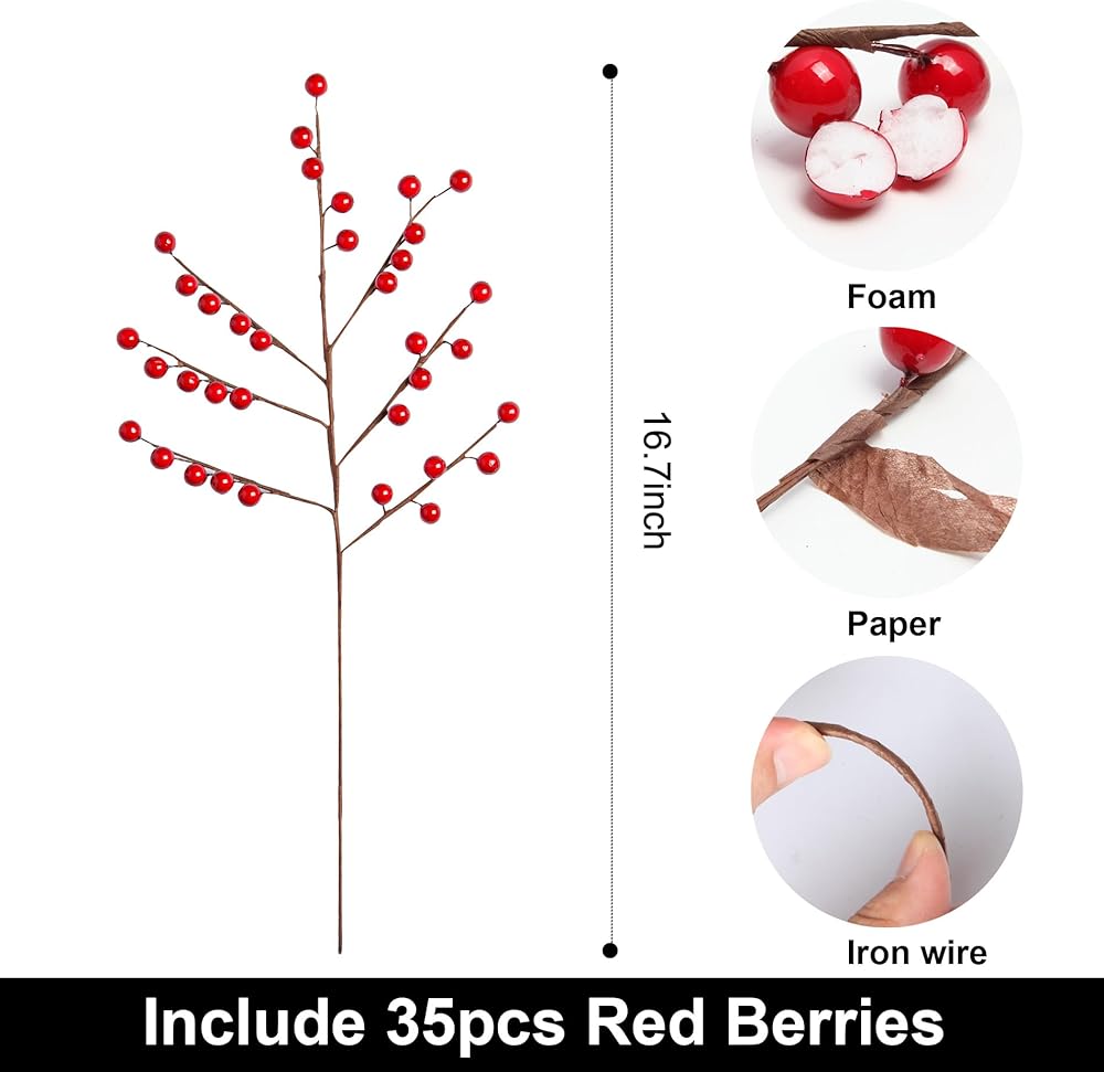 Quantity: This set of Christmas tree picks includes 36 packs of stems. Each stem is 13.8 inches long and has 5 branches, with each branch having 5 red berries. Total of 900 Red Berries,The diameter of each berry is 0.39 inches. Please check the pictures for more details.