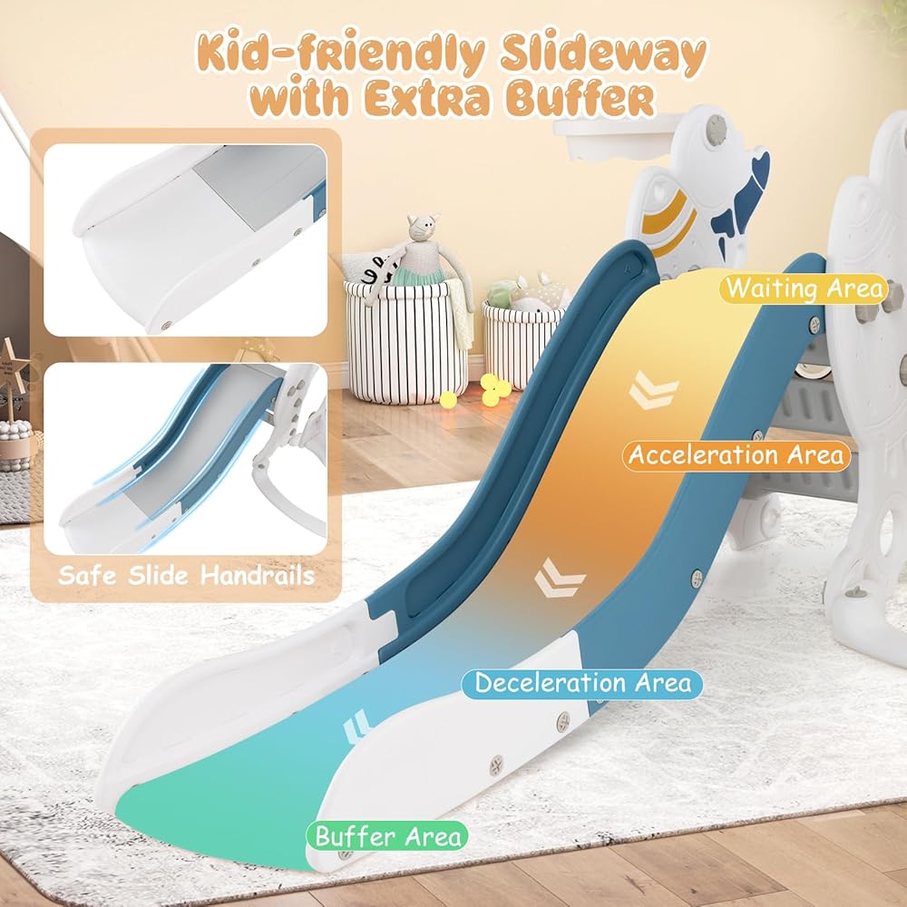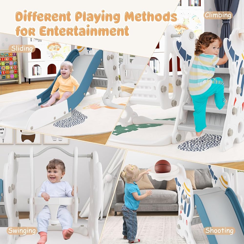 【4 in 1 Swing and Slide Set】 Kid slide is a versatile toddler playground, which includes climber, swing, slide, and basketball shooting feature, which offers a variety of activities to keep children engaged and entertained. It offers your little one aged 18+ months old different playing methods for entertainment, and exercises their motor skills and hand-feet coordination during their playtime.