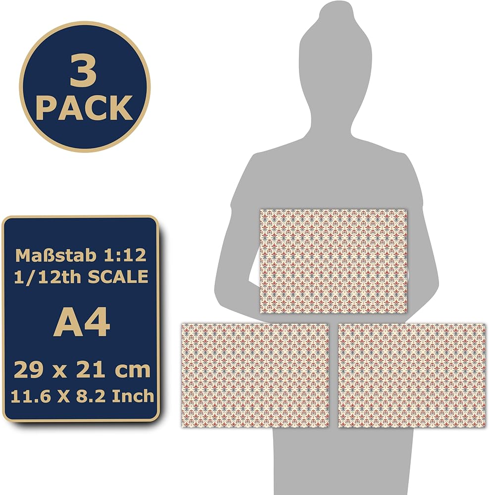Large, high-resolution flooring for dollhouses or toy houses in high print quality in 1:12 scale. The print is done on a sticker film so that the entire floor covering can be glued and does not slip. With scissors, you can cut the stickers to any shape and adjust them to your dollhouse. Perfect for personalising your dollhouse and equipping with high-quality accessories. Popular with hobbyists and children to implement DIY and custom projects. Align your model making dollhouse, dollhouse with wallpaper in the look of high-quality wallpaper. The wallpapers are available in varied styles from modern wallpaper, to repeating, seamless patterns to Art Deco wallpapers. The product is compatible with DIY dollhouses or toy houses of various brands. Box contents: 3 sheets of self-adhesive toy flooring in the size DIN 4 (297 x 210 mm = 1/16 m²) (8.2 x 11.6 inches). Browse our other items to match your order with other materials for your dollhouse.