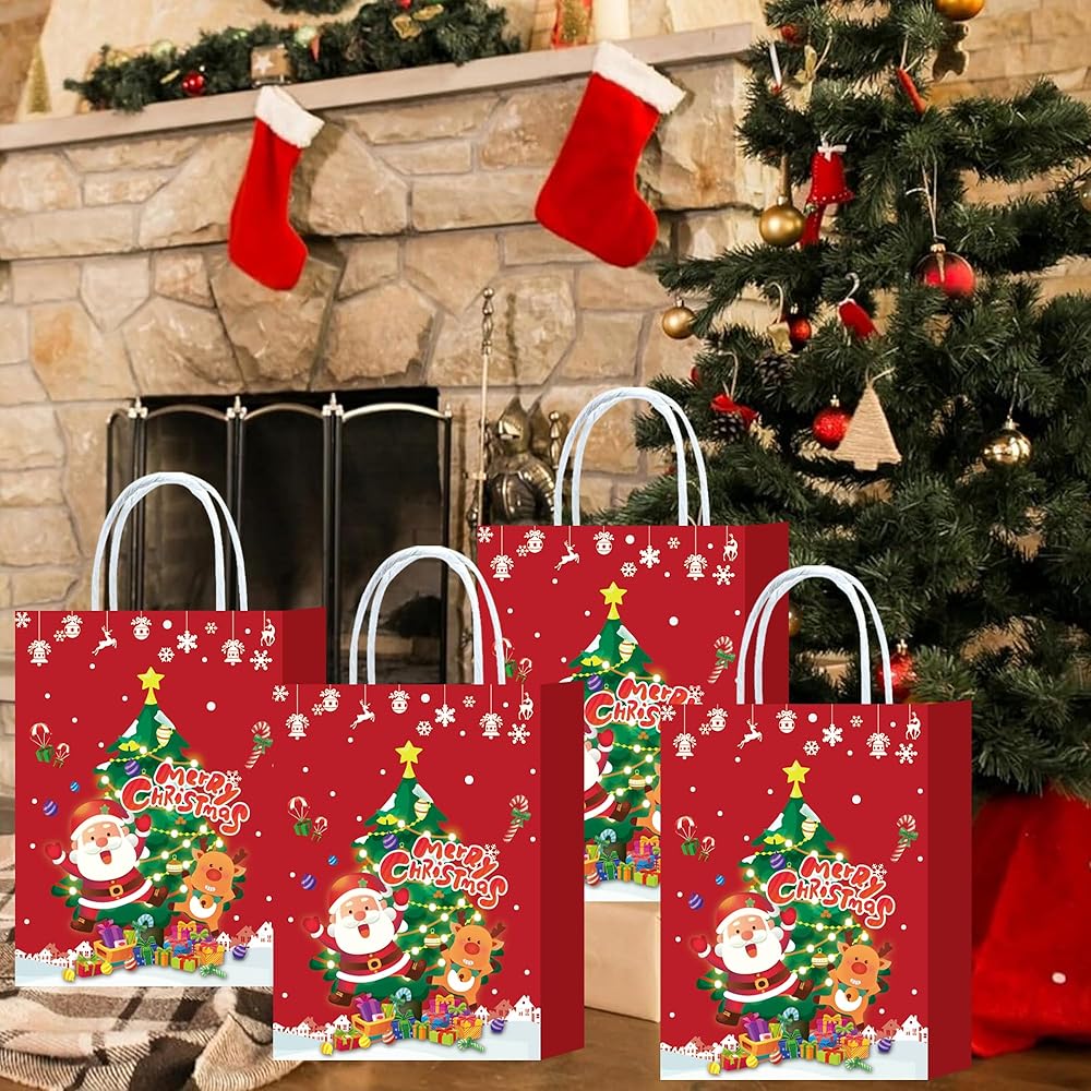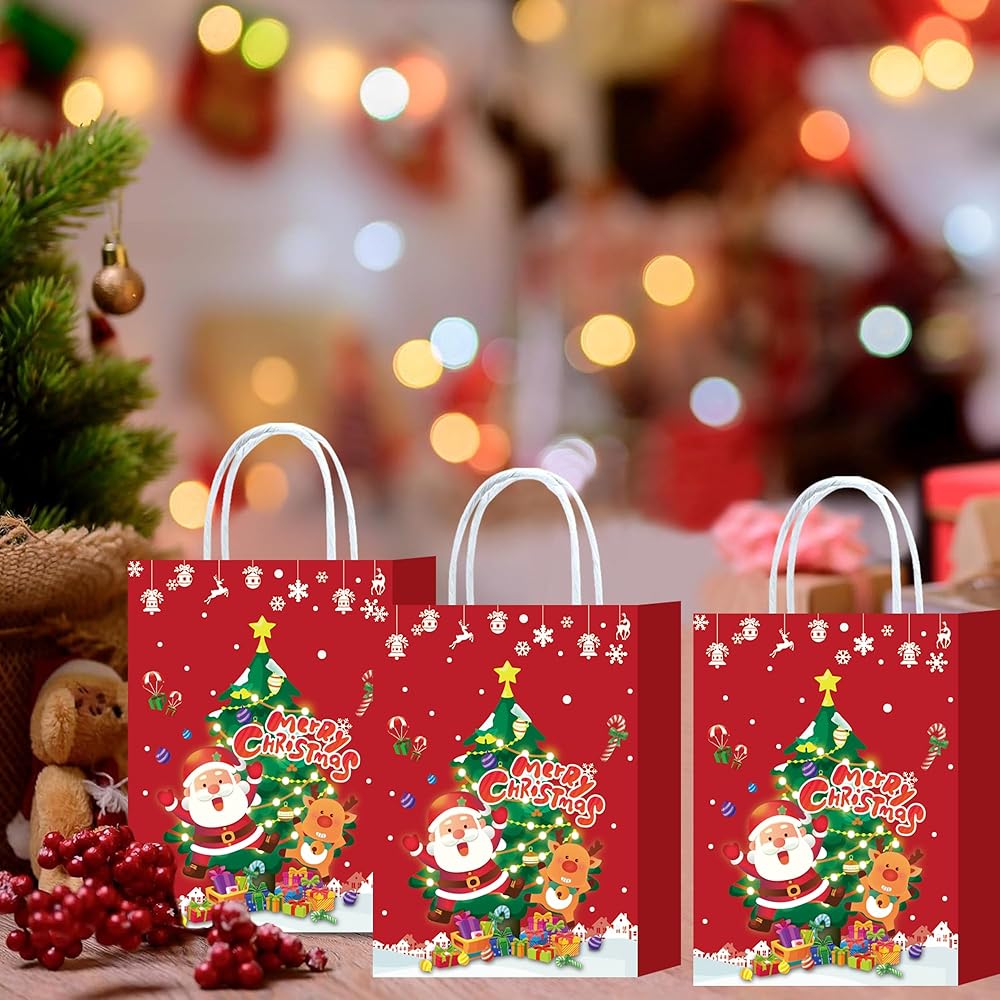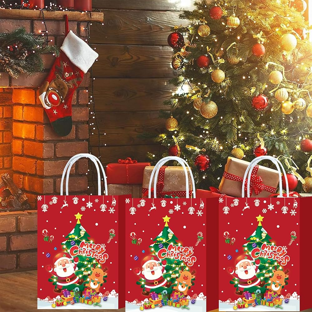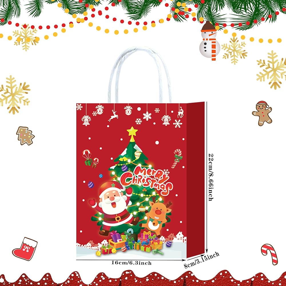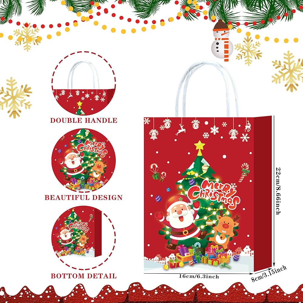 【Christmas Gift Bags Set】24 pieces Christmas gift bag with handles, measure about 8.66 x 6.3 x 3.15 inches, many styles, sufficient quantity and various elements can meet your Christmas party needs, an be used interchangeably, creating a happy atmosphere for Christmas or birthday party.