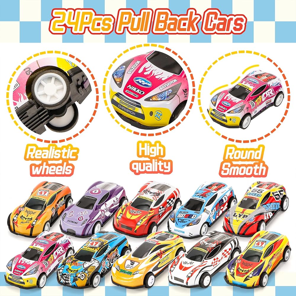 SevenQ Toy Cars for Kids, 24Pcs Race Cars Pull Back Cars Playsets with Storage Bags,Party Favors Kids Prizes Fillers Bulk Gifts for Boys and Girls Car Game Treasure Chest