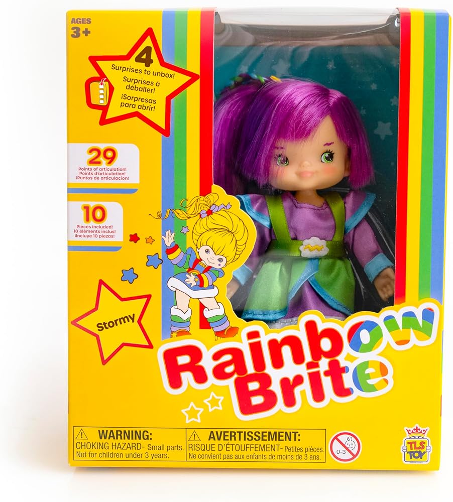 With 29 points of articulation, Rainbow Brite is fully poseable, elevating the play experience and allowing kids to unleash their creativity. Comes with 7 classic stickers, and 4 surprise accessories that may include combinations of the iconic comb, purses, fashion accessories, lunchboxes (a nod to the 80's lunchboxes), and super rare finds too.