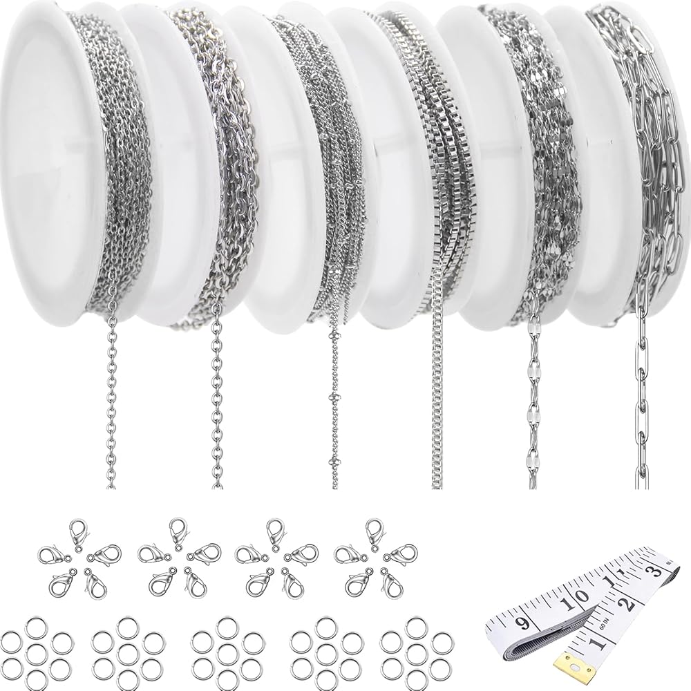 【112 Feet 14 Style Jewelry Chains】Included 112 Feet(34.2m) Stainless Steel Chains for Jewelry Making, 100pcs 6mm Stainless Steel Jump Rings,100pcs 5mm Stainless Steel Jump Rings, 30pcs Stainless Steel Lobster Clasps, 10pcs Flat Snake Chain Connectors, 10pcs Roun Snake Chain Connectors, 10pcs Ball Chain Connectors, 14 Fashionable Chain Designs To Meet The Needs Of Different Preferences And Occasions.