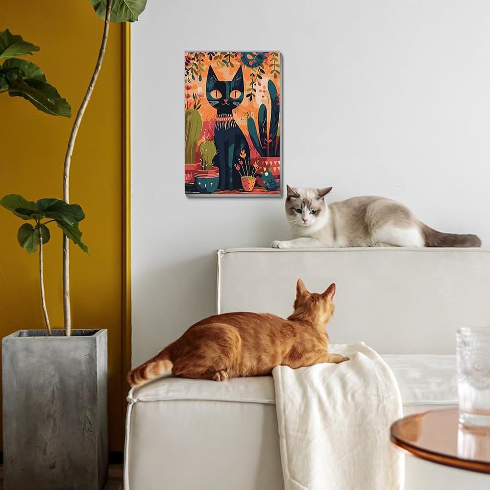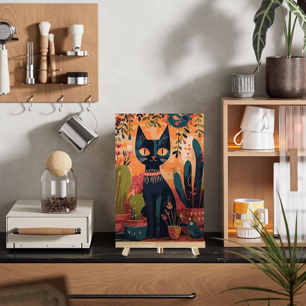 Framed with Easel Paint by Numbers Kit for Adults Beginners, Black Cat Cactus Easy Acrylic Watercolors Oil Number Painting Art on Streched Canvas with Easel for Home Wall Decor and Gift 7.8x11.8inch