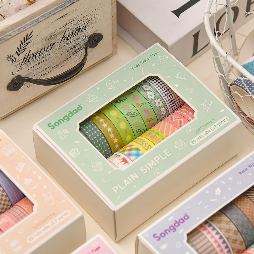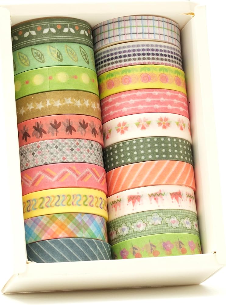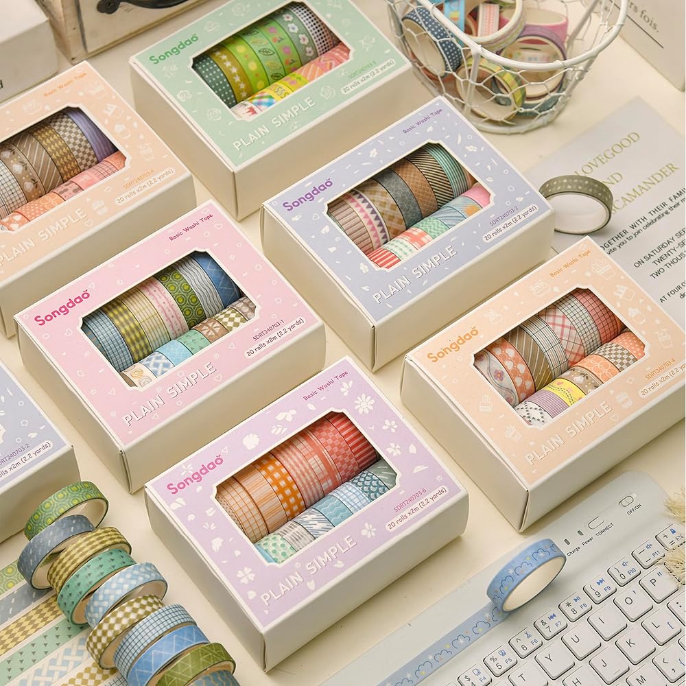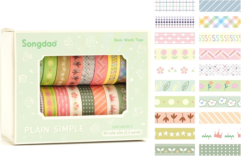 20 Rolls Basic Washi Tape Set Japanese Arts Adhesive Tapes Simple Patterns Decorative Masking Tape Sets for Craft, Kids, Scrapbook, DIY, Gift Wrapping (Style Five)