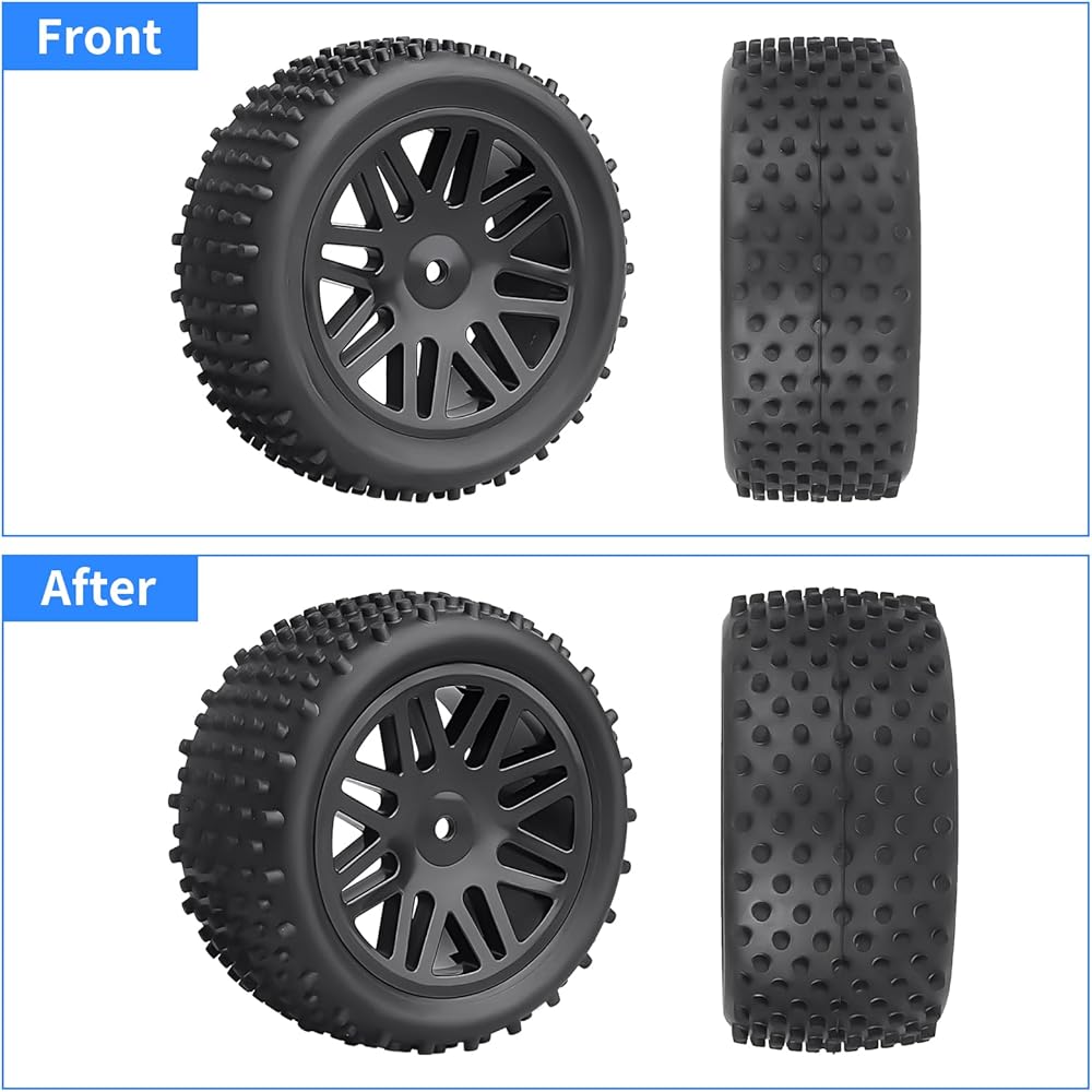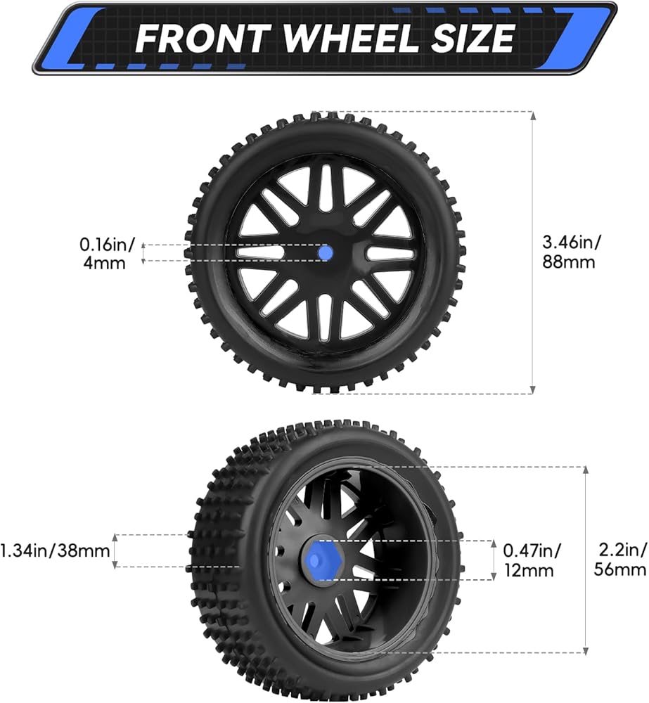 - Tires Outer Diameter(Height): 3.38" (88mm) | Width: 1.65"& 1.34" (42mm & 34mm) , Inner Diameter: 2.2" (56mm) Wheel Hex:12mm, Axle Hole: 4mm.