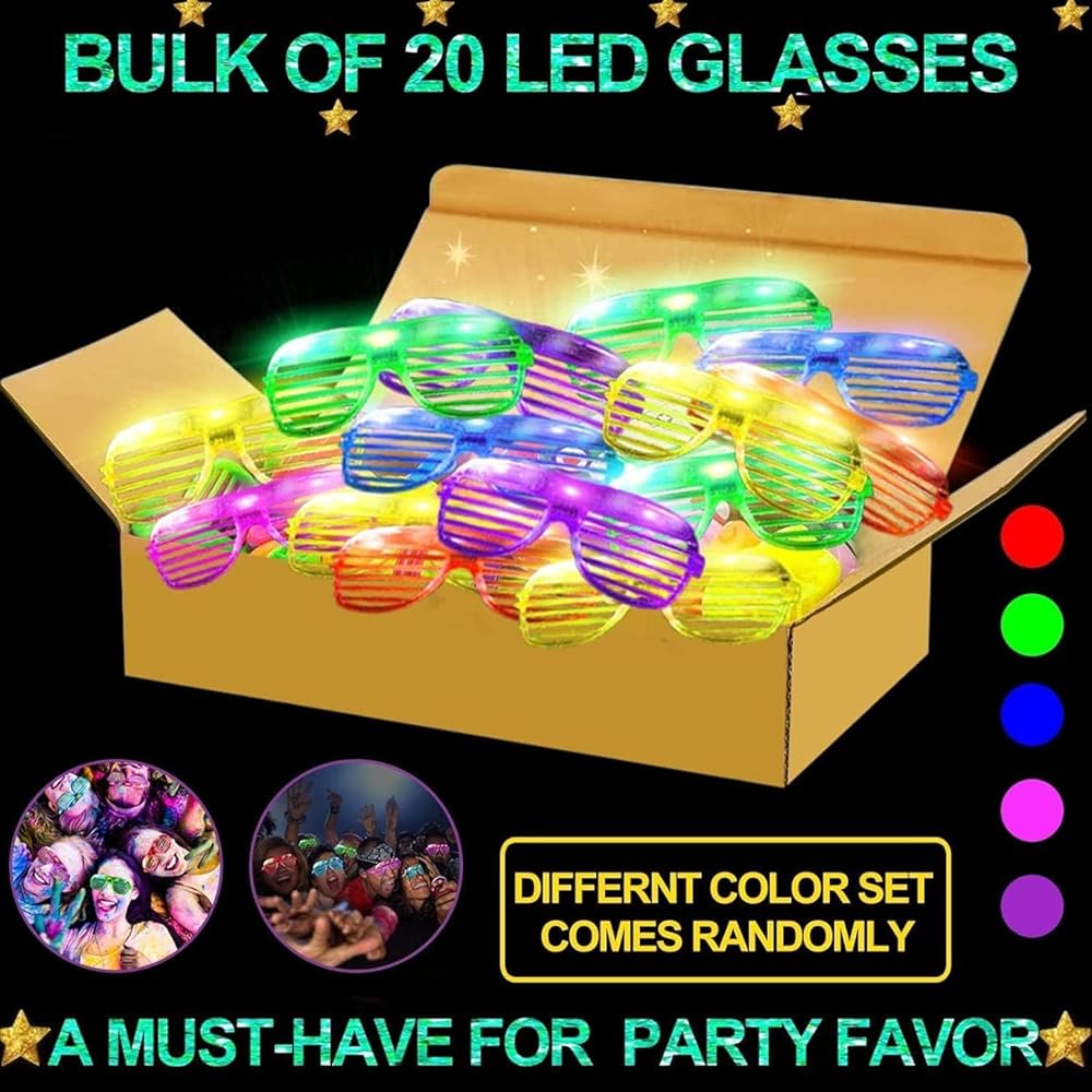Perfect Neon Glow Party Supplies: LED glasses party pack include 20 led glasses 6 color, Pink, Green, Red, Purple, Blue,White. 3 LED lights are installed. Just press the switch and you can switch to fast flashing mode of your LED Light up Glasses