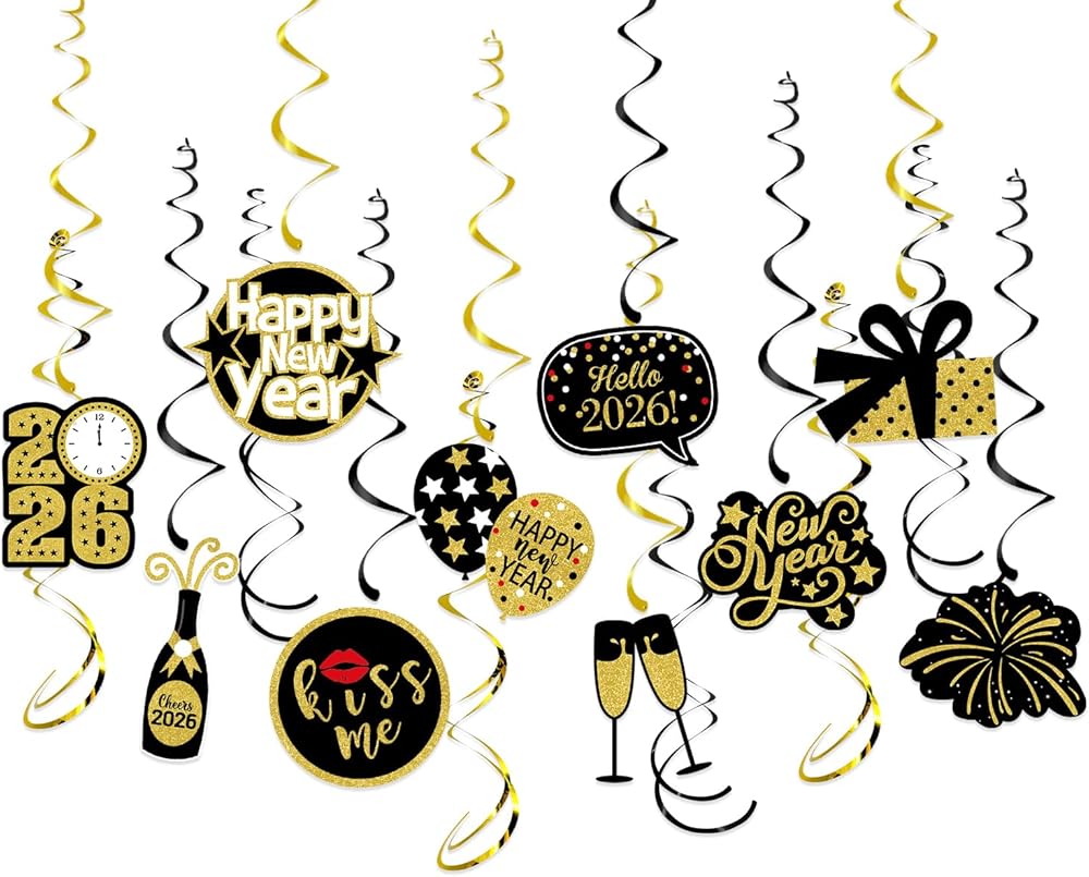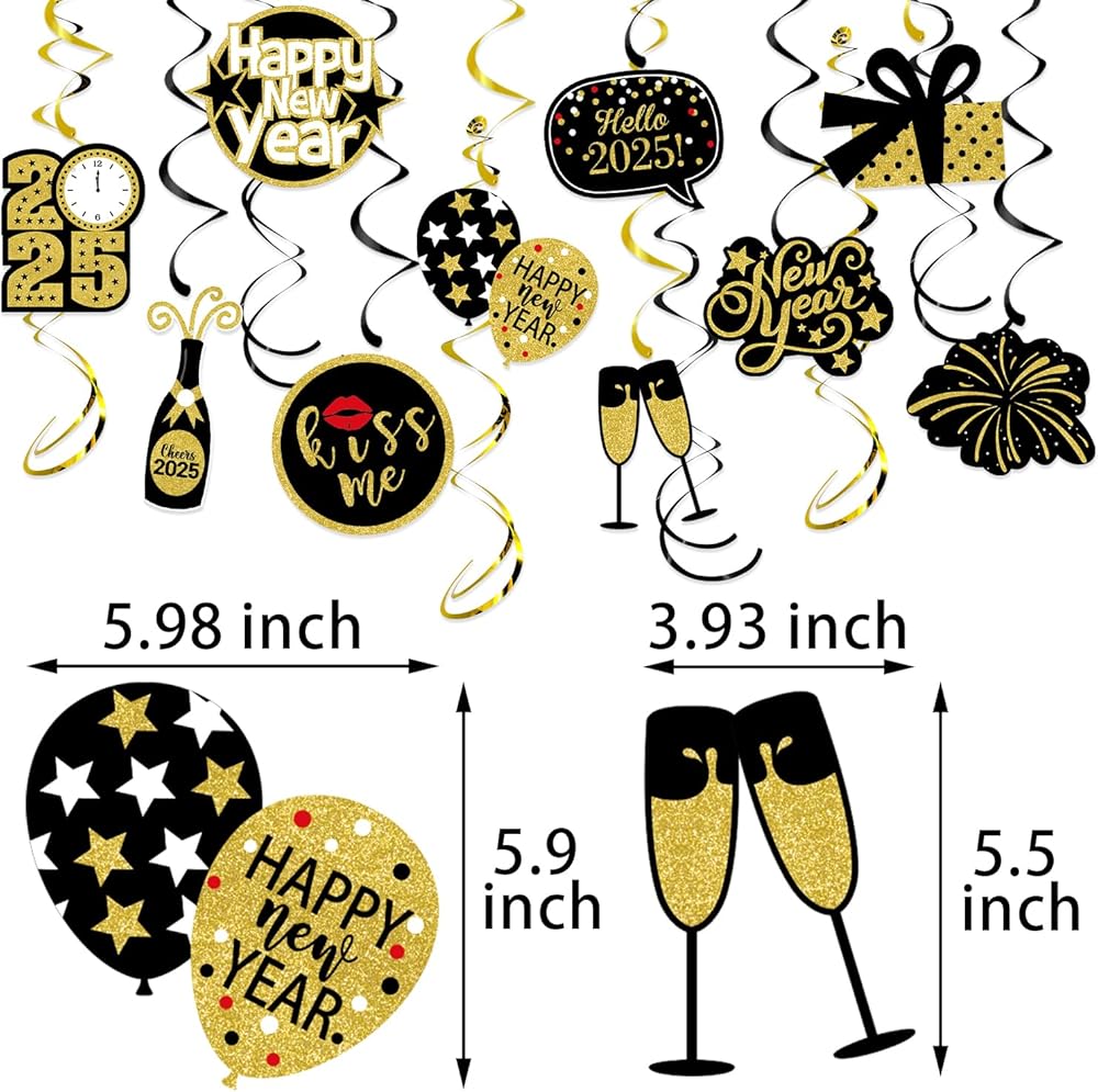 【Package including】The party swirl streamers includes 10 different styles card cutouts with swir and 6pcs double swirls in black and gold color, which will pread the new year theme in room or any party space. 【Material】The material is double shimmery metallic foil pvc and high quality card stock. They are durable and re-usable. 【 Easy to hanging 】Just open the pre-strung foil swirls with different shape cutouts to hang it directly no need to diy again.Because they are pre-assembled and ready to use. 【Widely Used】They are perfect for new years decorations,new years eve party supplies,happy new year glasses,new years decorations hats and other party events. 【Quality Guarantee】If you are not satisfied with the color, quality or other aspects,please contact us for refund or replacement.
