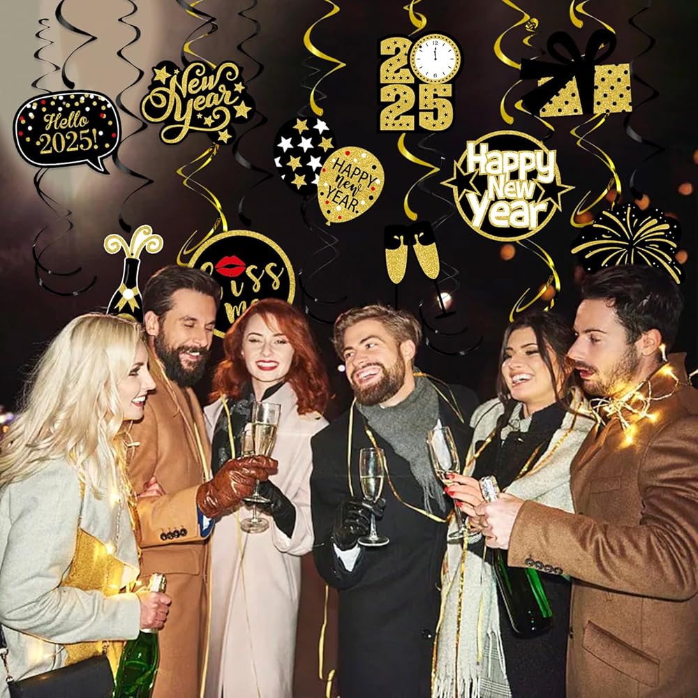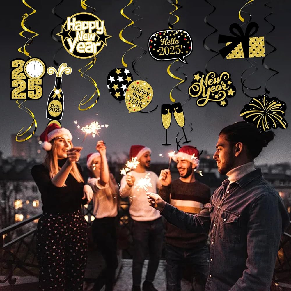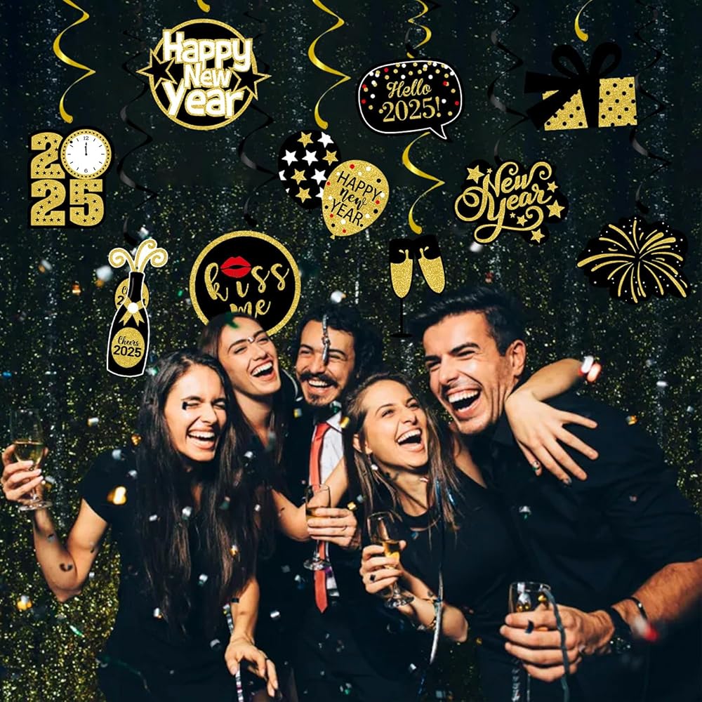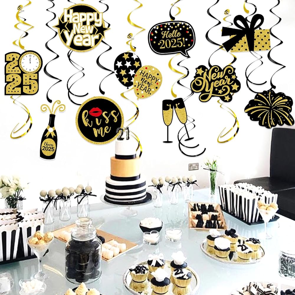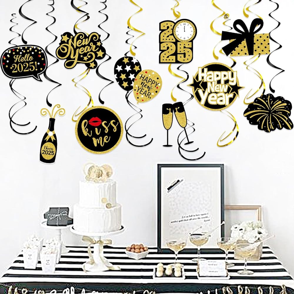 【Package including】The party swirl streamers includes 10 different styles card cutouts with swir and 6pcs double swirls in black and gold color, which will pread the new year theme in room or any party space.
