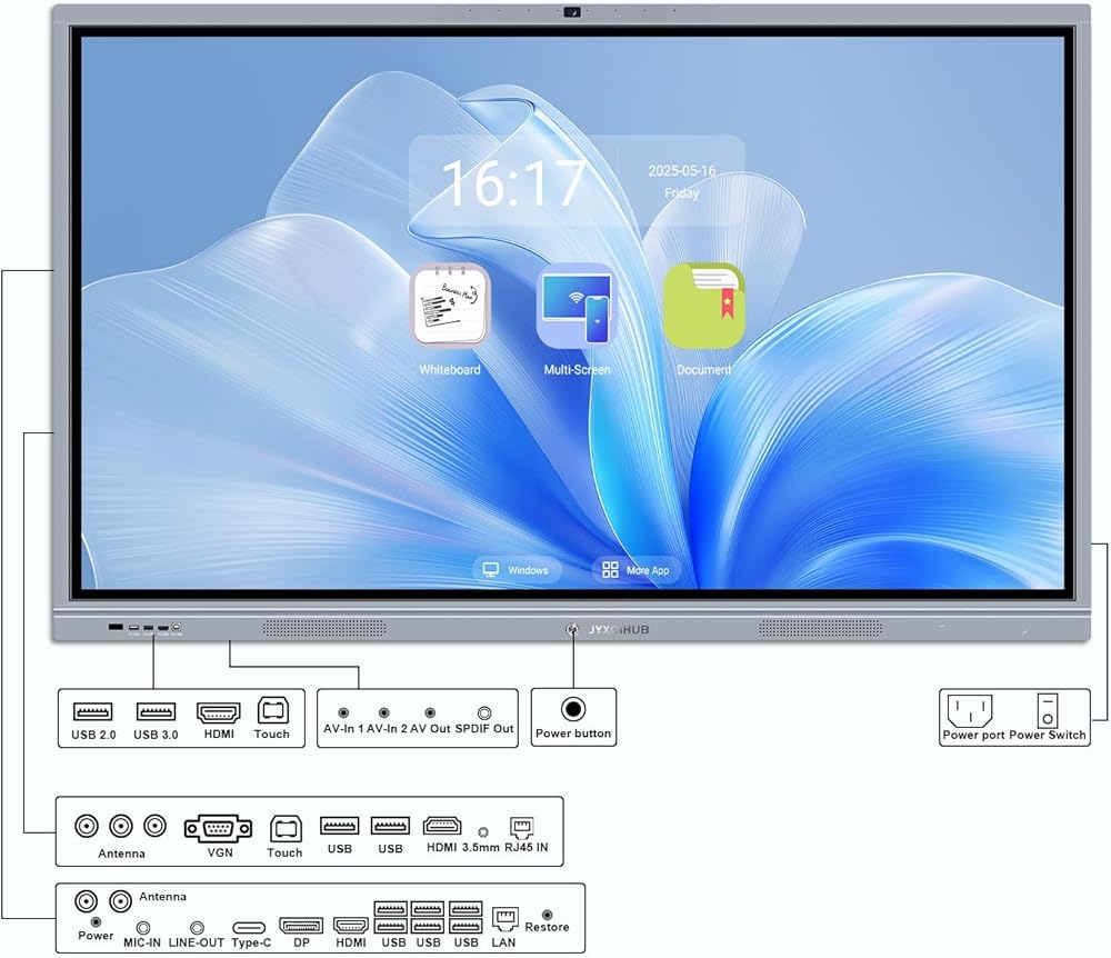 【Dual System Interactive Whiteboard】 JYXOIHUB smart board build in Android OS and Windows OS. Advanced Android OS(Android 11.0, 4GB RAM + 32GB ROM)is like a smartphone, Robust Windows OS(9th generation 9300H OPS computer, 8GB RAM + 128GB SSD and Windows10 Intel i5 CPU)makes JYXOIHUB white board ahead of other competitors. Excellent hardware provide the best ever writing experience: smooth and accurate, 6ms response time ensures the stylus to touchscreen experience is natural and familiar.