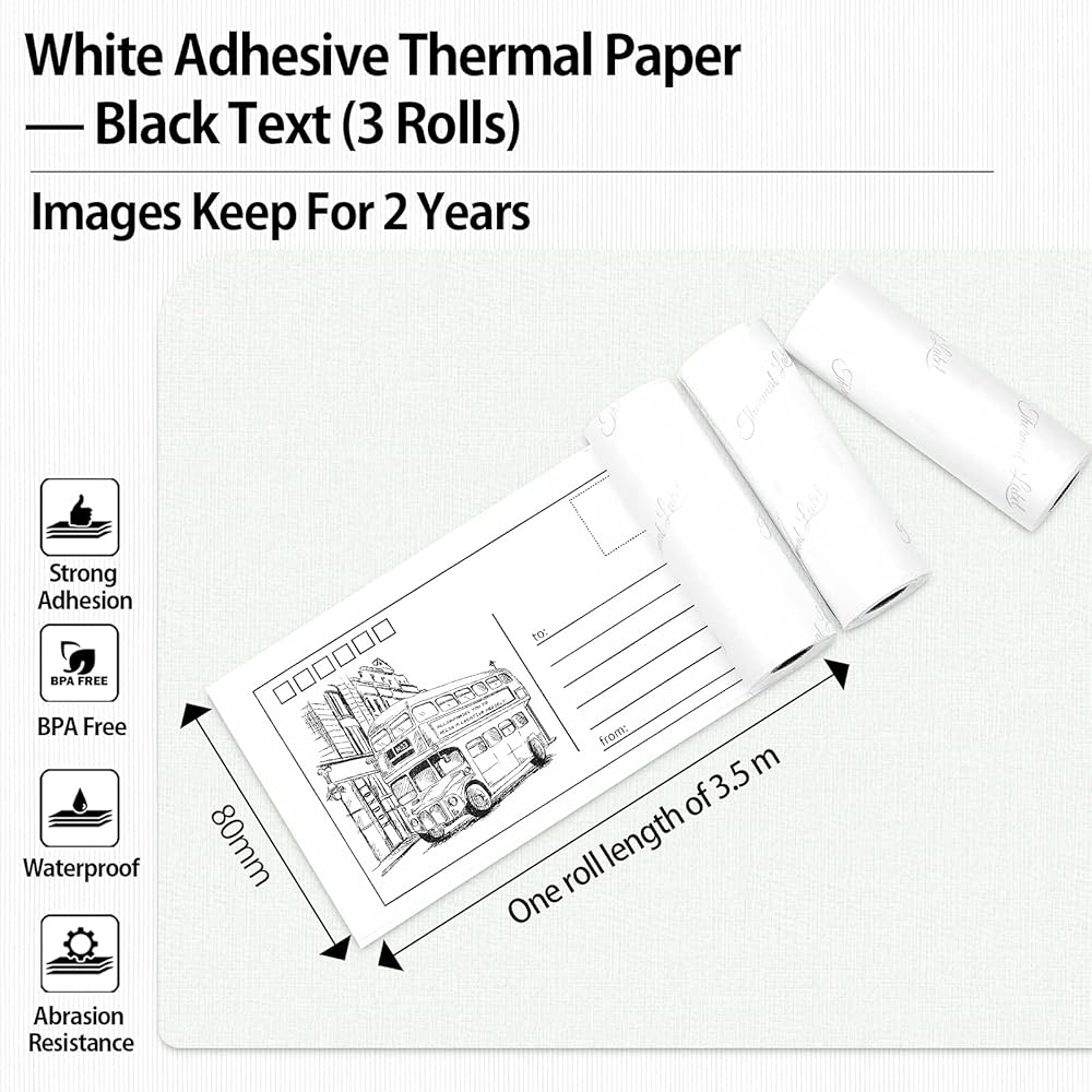Paper Details: Memoqueen M03 printing paper, 3 rolls of White adhesive thermal paper sticker paper thermal paper, wide width of 3" (77 mm), black text, 2 year shelf life, Please charge fully before printing, the image will be clearer