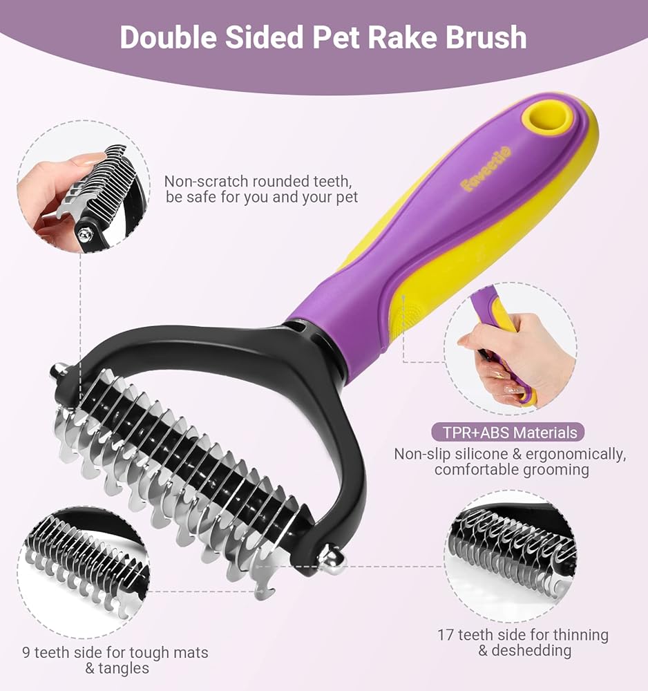 🐕【Double Sided Dematting Undercoat Rake】: Use the 9 teeth side of this deshedding brush to remove stubborn mats and tangles, finish with 17 teeth side for coat thinning and deshedding; achieve faster and more professional dematting and grooming results. Smooth rounded teeth gently remove mats, tangles, knots, loose hair without scratching your pet's skin. * The grooming rake can be rinsed to clean and hung to dry.