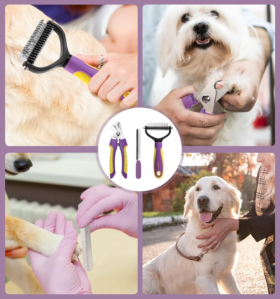 🐱【Effective Pet Shedding Brush】: All in one grooming brush kit, perfect for deshedding loose hair, nail clipping, nail filing. Regularly use this pet comb to remove dead undercoat for your pet, not only to prevent skin diseases but also massages pet's skin and improves blood circulation, promoting healthy and shiny coat. Suitable for medium and long haired dogs and cats and other pets with thick coat.
