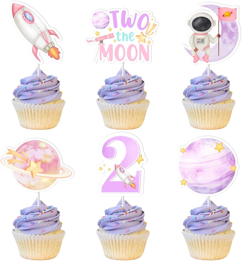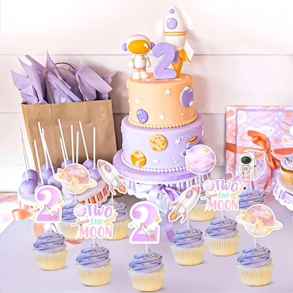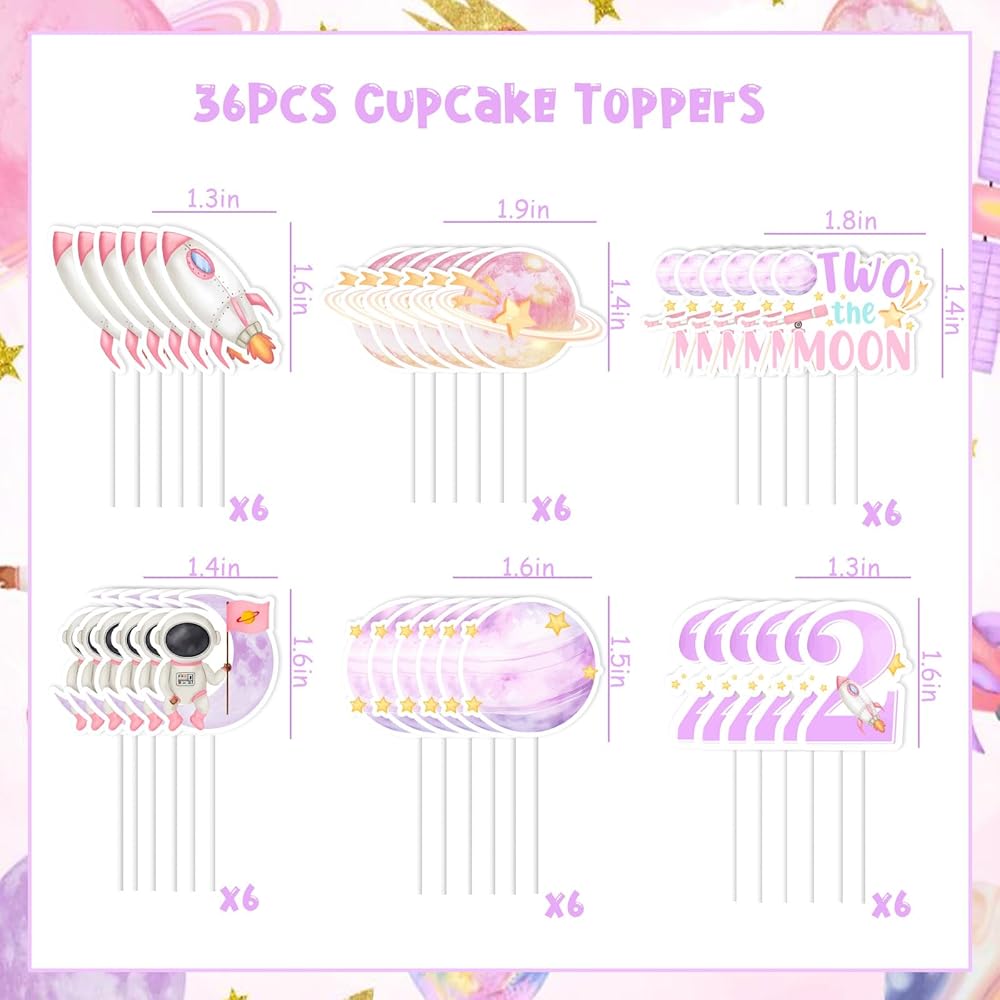 Jollyboom Two The Moon Birthday Decorations, 36pcs Outer Space 2nd Birthday Party Decoration Cupcake Toppers Pink Planet Rocket for 2 Year Old Girl Galaxy Solar System Bday Party