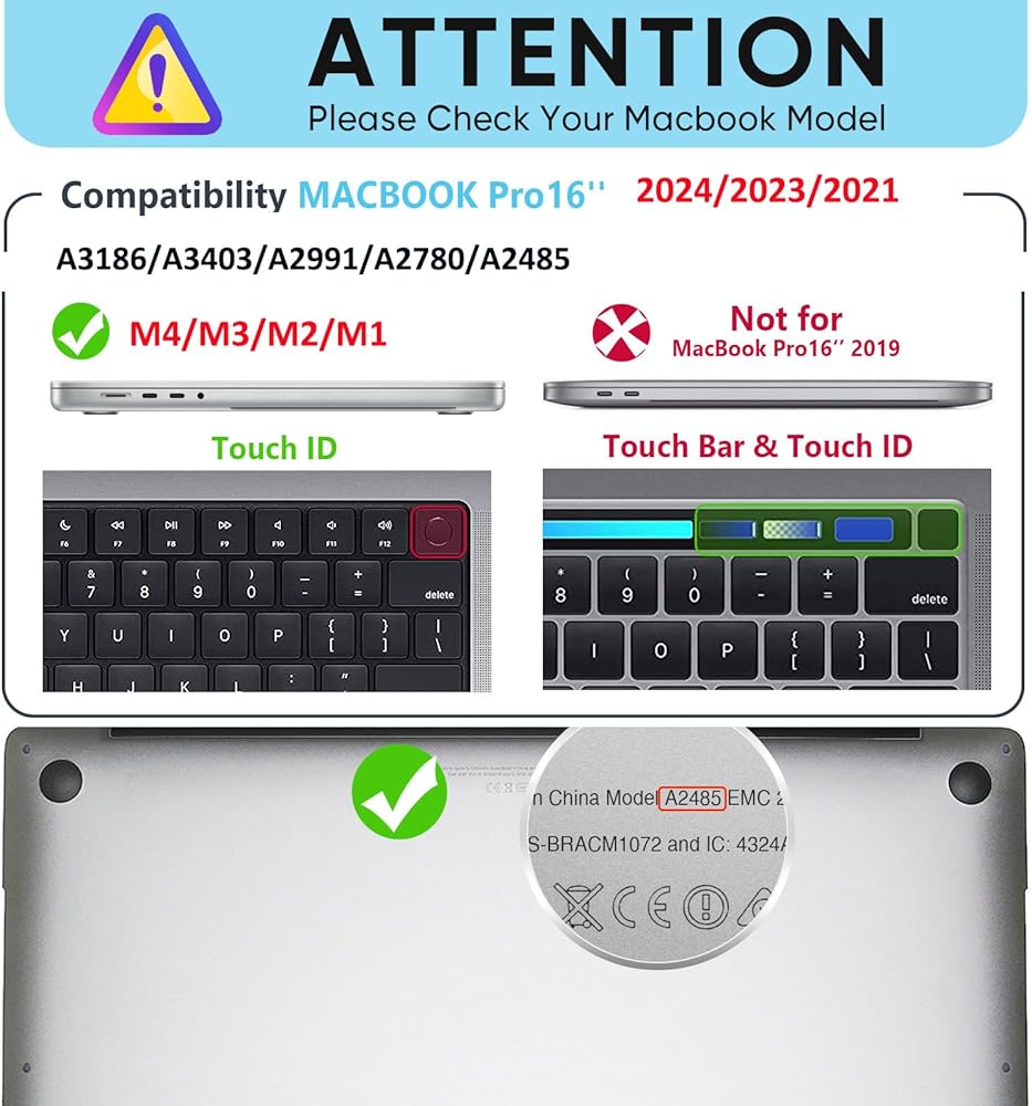 • Check Model Number : ONLY compatible with MacBook Pro 16 inch Cover M3/M2/M1 (A2991 / A2780 / A2485) 2023/2021 released, not for other models, and you can find step by step install instruction video in our store.