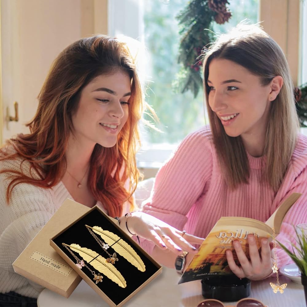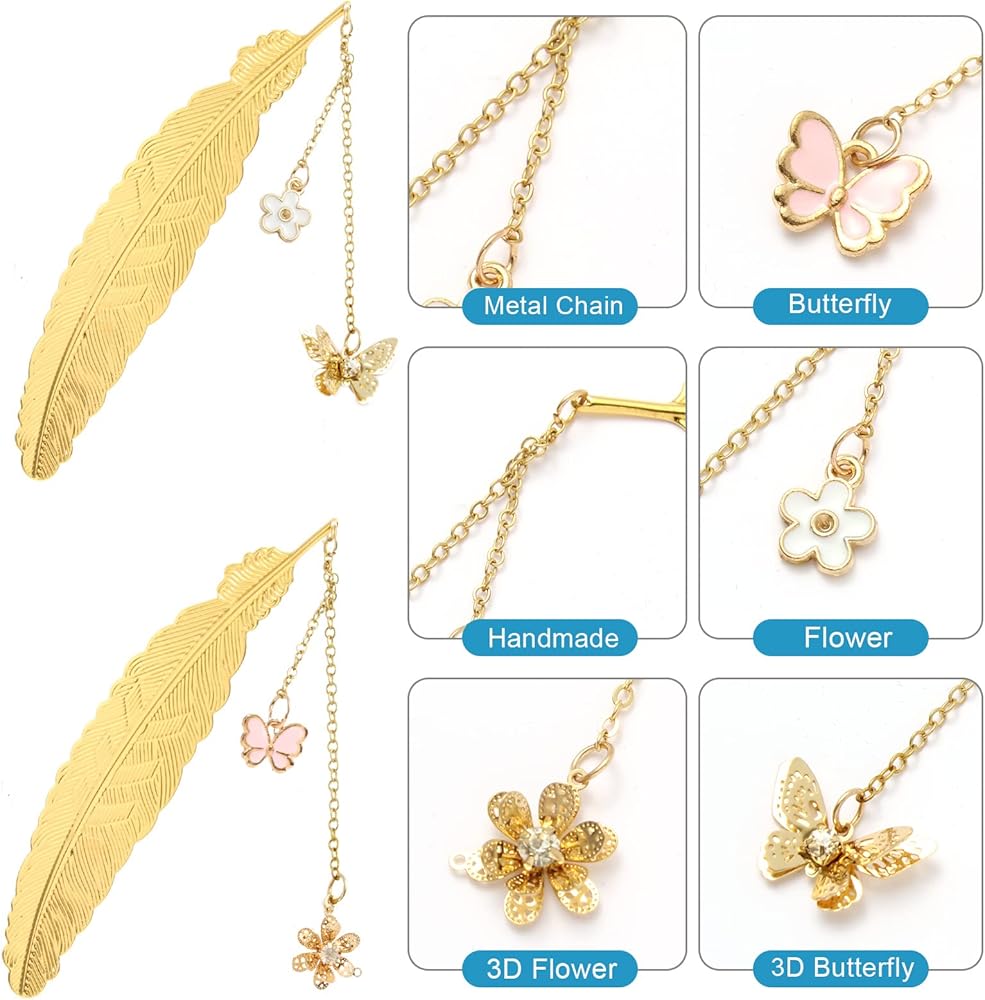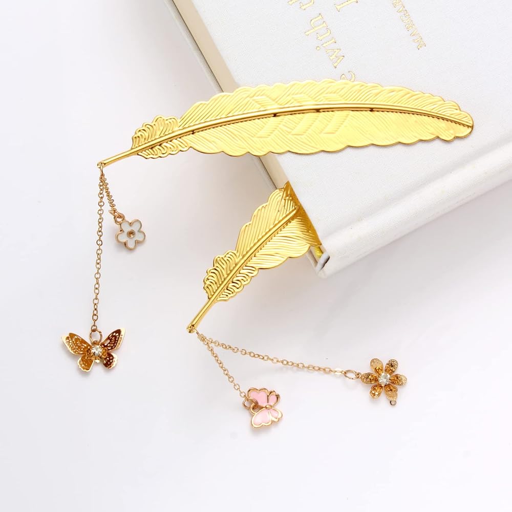 <p>VARIOUS STYLE - The gift box contains 2 pieces of golden metal feather bookmarks with pendants of 3D Flower & Butterfly and 3D Butterfly & flower. </p>