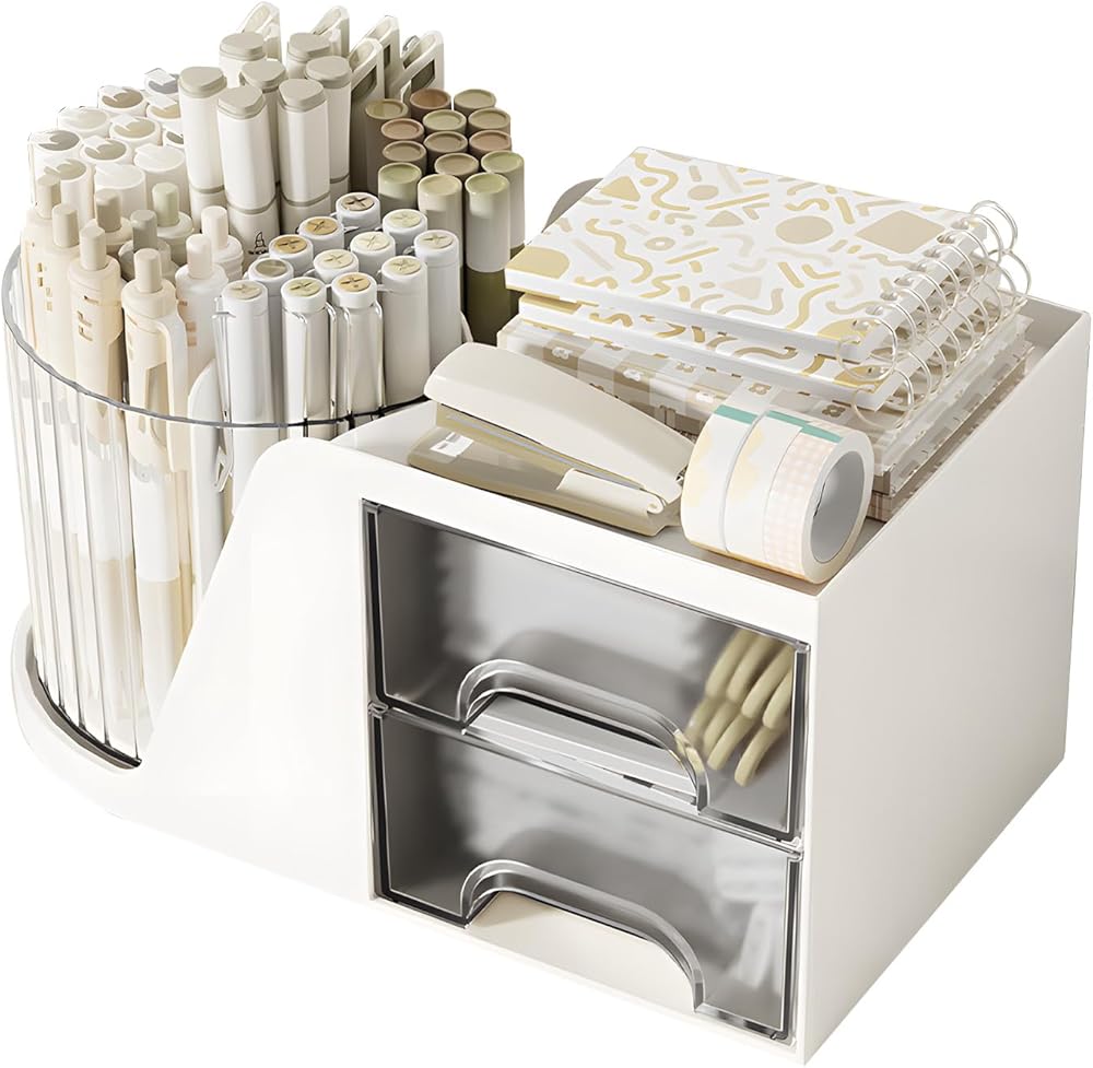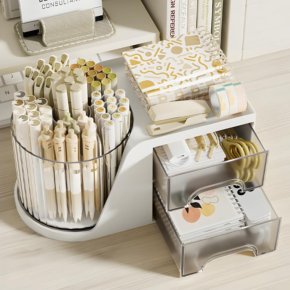 Rotating Desktop Pen Holder: This desktop organizers consists of two parts, a 5 slots pen holder and a storage box with 2 small drawers.The 5 slots pen holder can rotate 360 degree to the left and right. You can rotate it to any angle to easily store or take out the things you want.