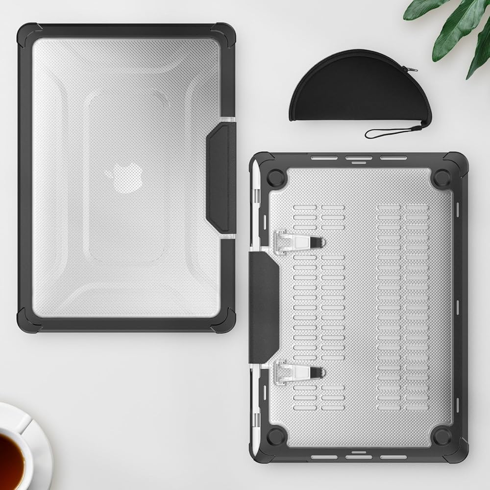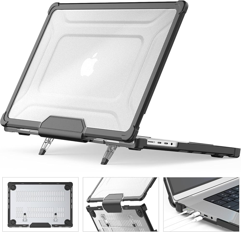 Foldable Kickstand : Designed with anti-slip sturdy kickstand, which gives a nice height adjustment to prop the laptop up, offering a more friendly typing angle and viewing angle. The vents on the bottom can also help the heat dissipation, comfortable for daily use, the built-in stand can be folded up when not in use.