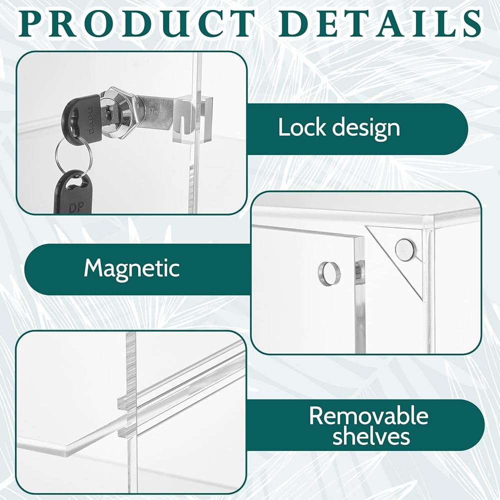 Showcase Various Items: this acrylic display case with shelves is designed to accommodate a wide range of items such as cosmetics, jewelry, perfumes, collectibles, souvenirs, figurines, watches, knives, pebbles, and more; It provides an ideal way to present your precious keepsakes in a stylish yet safe way