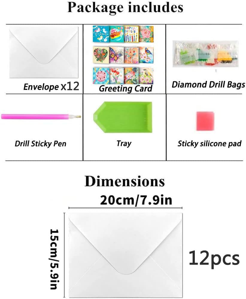 DIY Diamond Painting Kits:The DIY diamond painting greeting card set contains 12 pieces of different styles greeting cards &12 white envelopes,1 set diamond drill bags, 1 drill sticky pen, 1 tray and 1 sticky silicon pad. It's very fun and fast to make, simply follow the instructions in the description and you can easily create your own masterpiece
