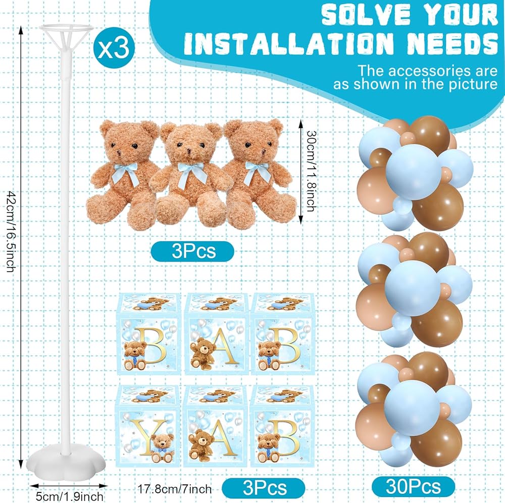 Jungle Animal Decorations for Baby Shower: you will receive 3 pieces stuffed animals ( 1 lion, 2 elephants) , 30 bear balloons baby shower in 3 different colors, 3 white balloon stands and 3 brown baby letter box centerpieces; They are sufficient for you to make 3 sets baby shower table centerpieces, adding a charming, jubilant and exciting sense