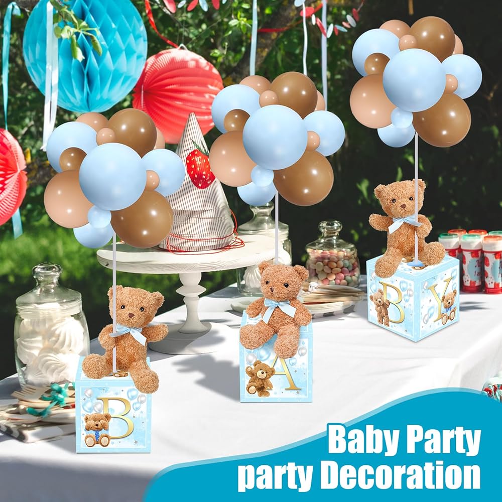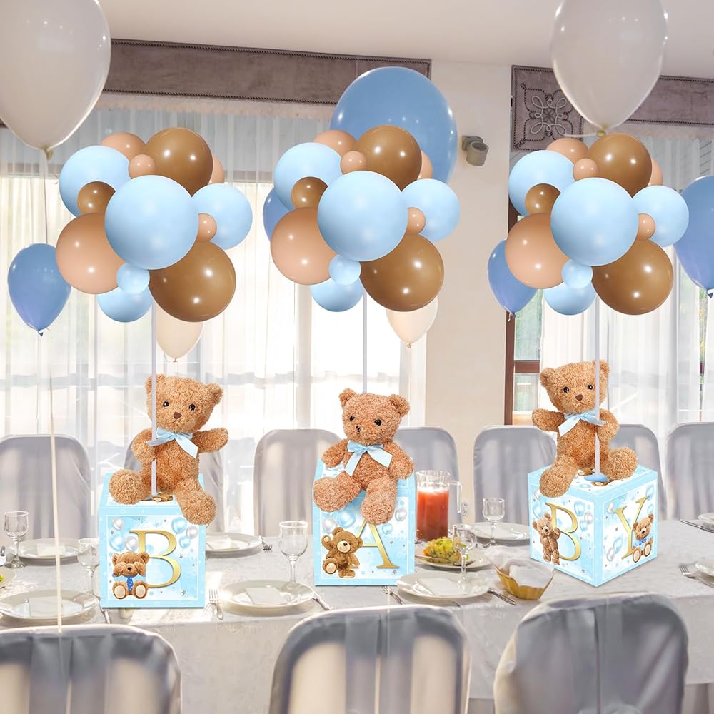 Lenwen 3 Sets Jungle Animal Decoration for Baby Shower Letter Boxes Baby Shower Table Centerpiece Stuffed Animals Balloon with Stand Plush Boxes for Party(Blue,Bear)