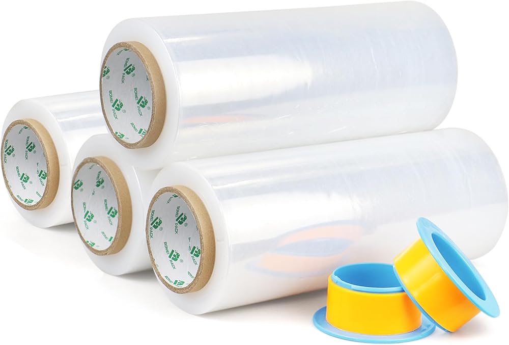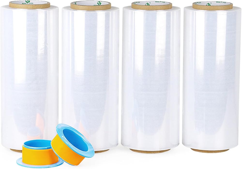 4 Pack Industrial Clear Stretch Wrap Film: Each order contains 4 rolls clear stretch wrap with two reusable plastic handles. Each roll is 10 inches wide x 1000 feet long and the 80 gauge thickness. Premium 80 Gauge (20 Micron) Shrink Film - Industrial strength and durable. Every single roll has a superior load retaining force