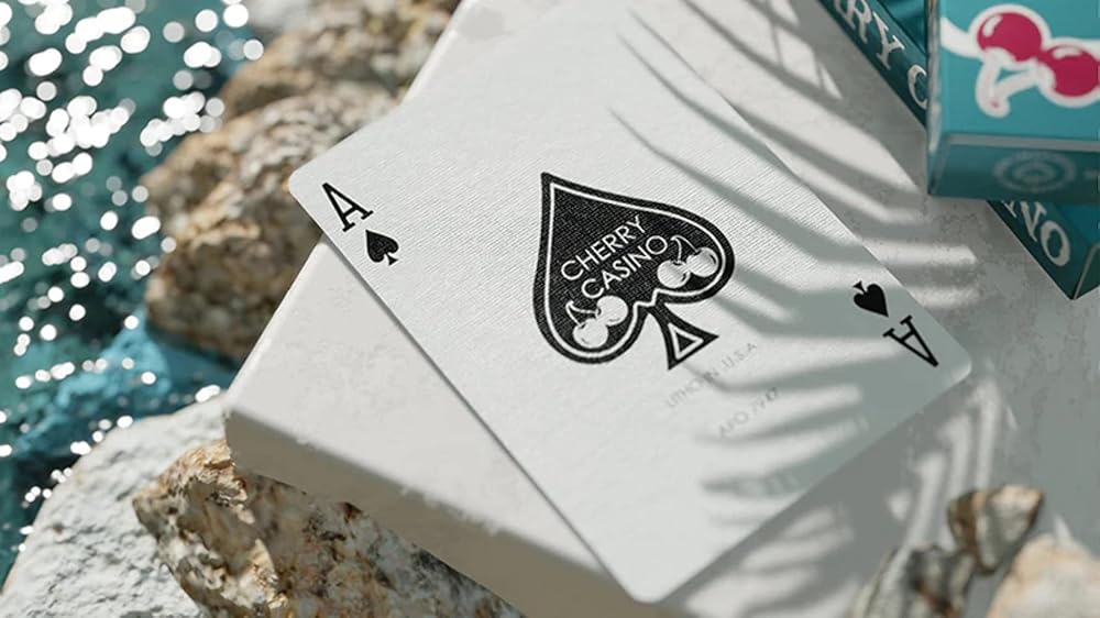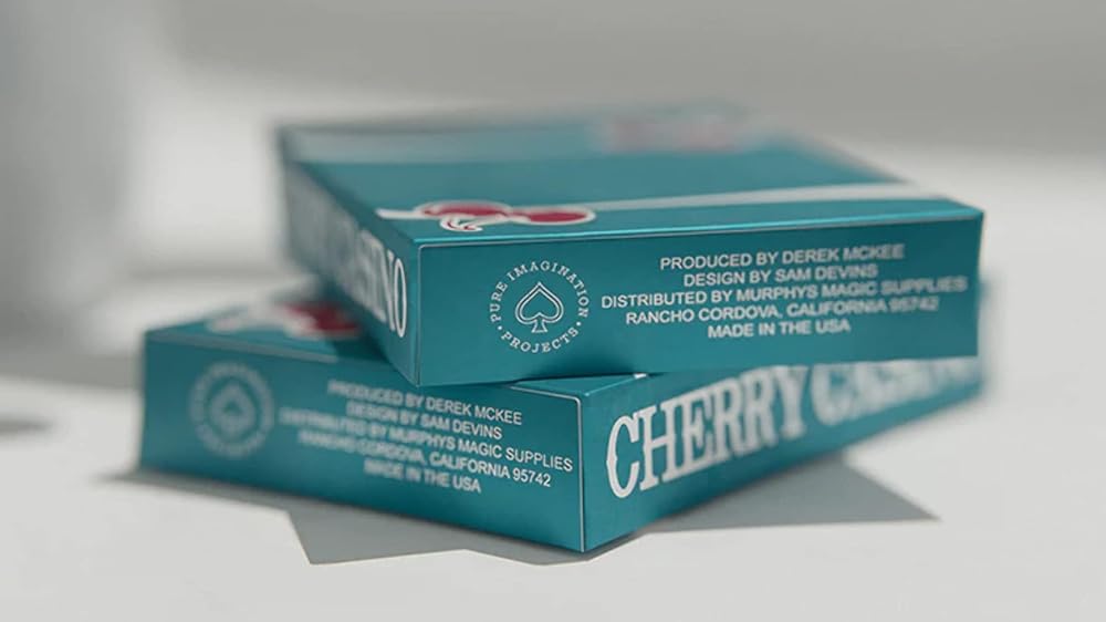 A little Miami, and whole lot of Vegas...make way for Cherry Casino Playing Card (Tropicana Teal). Take a break. Indulge yourself in the Tropicana Teal oasis of Cherry Casino Playing Cards. Dip your fingers into the deck and experience the intensely gratifying feel of the thin crushed Bee stock. Let your fingers ride the sleek swoosh characterized in modern 50's motif. Appreciate the symmetrical 2-way design and the snappy feel as you fan, cut and manipulate the deck. The pearlescent shimmer beckons you to the party. Magicians, flourishers, collectors, and gamblers are celebrating with the Cherry Casino Playing Card (Tropicana Teal). The stars are here. The jackpot is within reach. The tropics are waiting. Come join us. Printed by U.S. Playing Card Company with the finest quality Thin crushed Bee stock Designed by Sam Devins in partnership with Derek McKee Includes blank face and double backer gaff