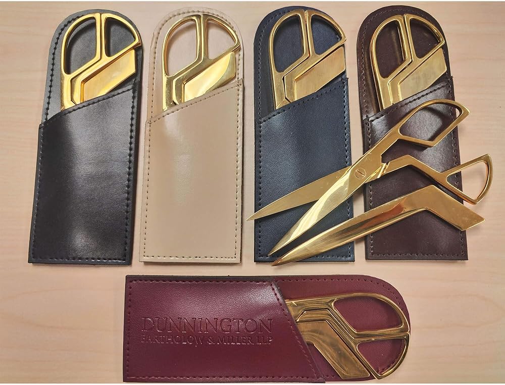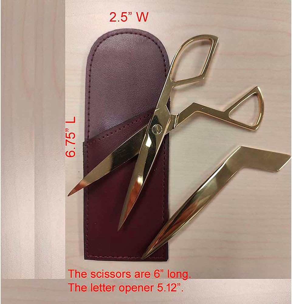 This stylish and affordable Bonded Leather Library Set includes a gold letter opener and pair of scissors which are stored in the bonded leather holder. The holder is solid giving this library set a sturdy look and feel while protecting the gold hardware. This functional piece makes for an ideal gift and coordinates with the entire Bonded Leather Collection.