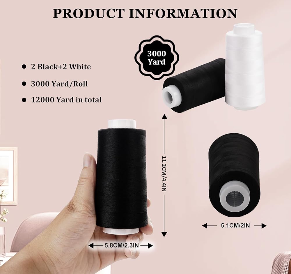 【4 colored polyester sewing yarns set】 The set consists of two colors of large overlapping yarns, each 4327 meters long (equivalent to 3000 yards), 4 cones total length: 12000 yards (10972 meters), providing an adequate supply.