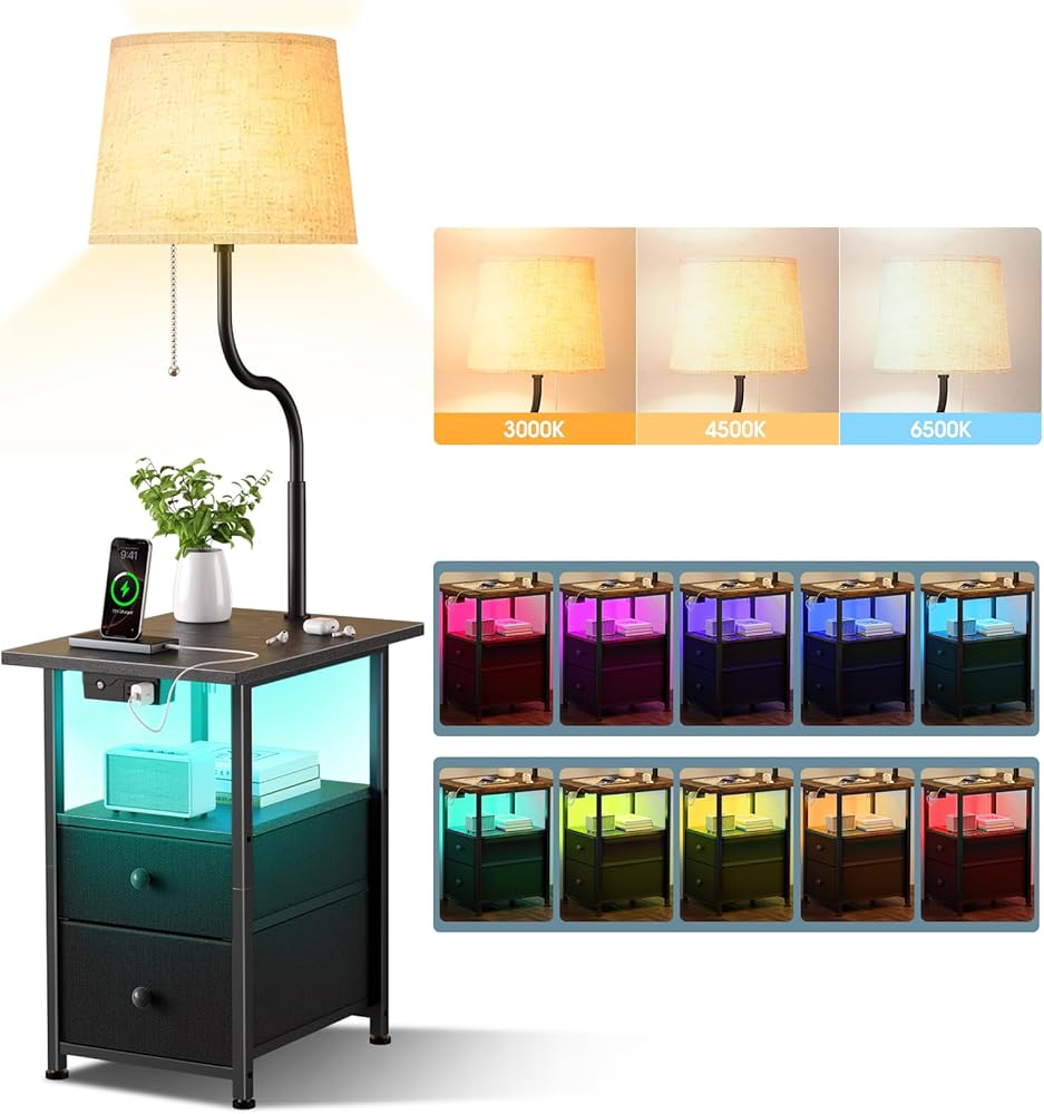 addlon Floor Lamp Side Table with Night Light,Night Stand with Charging Station and LED Bulb, 3-Color Adjustable Lighting Beside Table with 2 Deep Drawers, End Tables Living Room,Bedroom-Black Oak
