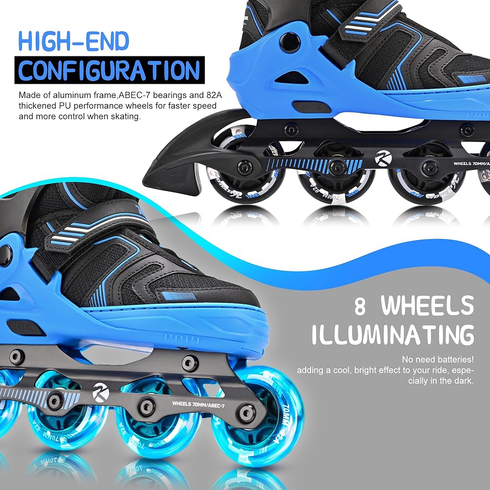 【8 WHEELS ILLUMINATING】Equipped with eight illuminating wheels, our inline skates light up automatically as you skate.Powered by the rolling motion, these lights do not require batteries, adding a cool, bright effect to your ride, especially in the dark.
