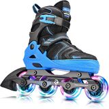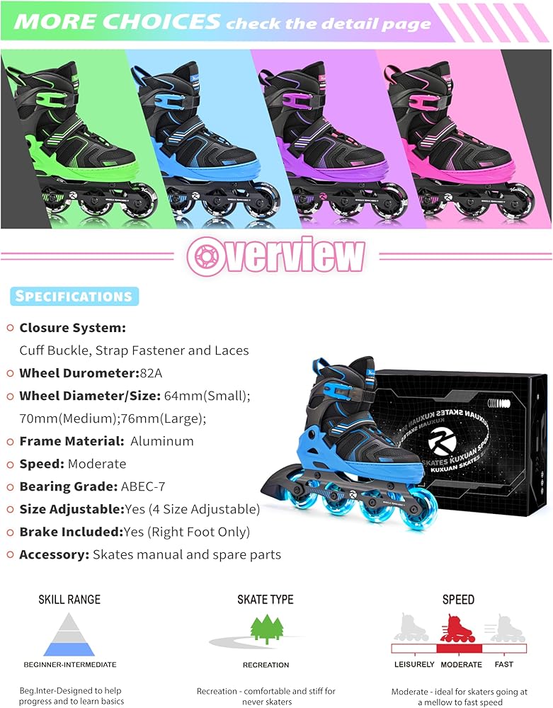 【ADJUSTABLE INLINE SKATES】Our inline skates have 3 different Unisex size , S/M/L, and each size is adjustable to to adapt to the growth of young people and accompany them for a long time.The adjustment process is simple, just press and hold the button to pull or push the skates toe to the fit size within some range,without much effort.